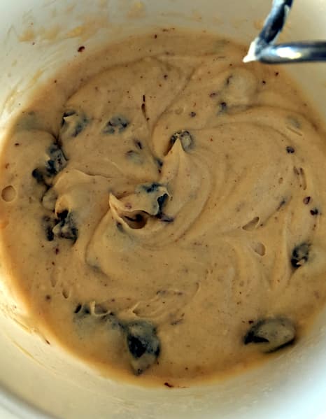 Высыпали содержимое пакета в миску, согласно инструкции добавили 160 мл воды и сто граммов мягкого сливочного масла. Вымешали достаточно густое аппетитного цвета тесто и положили в него пару горстей нарезанного чернослива (изюм тоже был бы неплох).