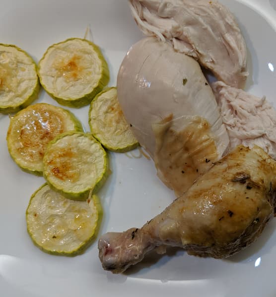 Через час мы обмазали курицу остатками маринада, не снимая с вертела, и запекали еще десять минут. А под курицу поставили противень с кружочками кабачка, посыпанными солью и пармезаном.