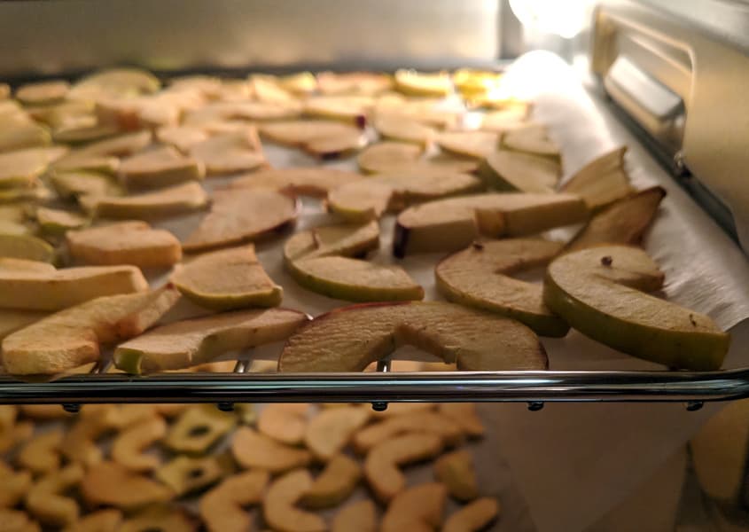 Проверяем работу мини-печи при температуре ниже заявленной производителем как минимальная. Это хорошо делать в режиме сушки, так что придется опять резать килограммы яблок.