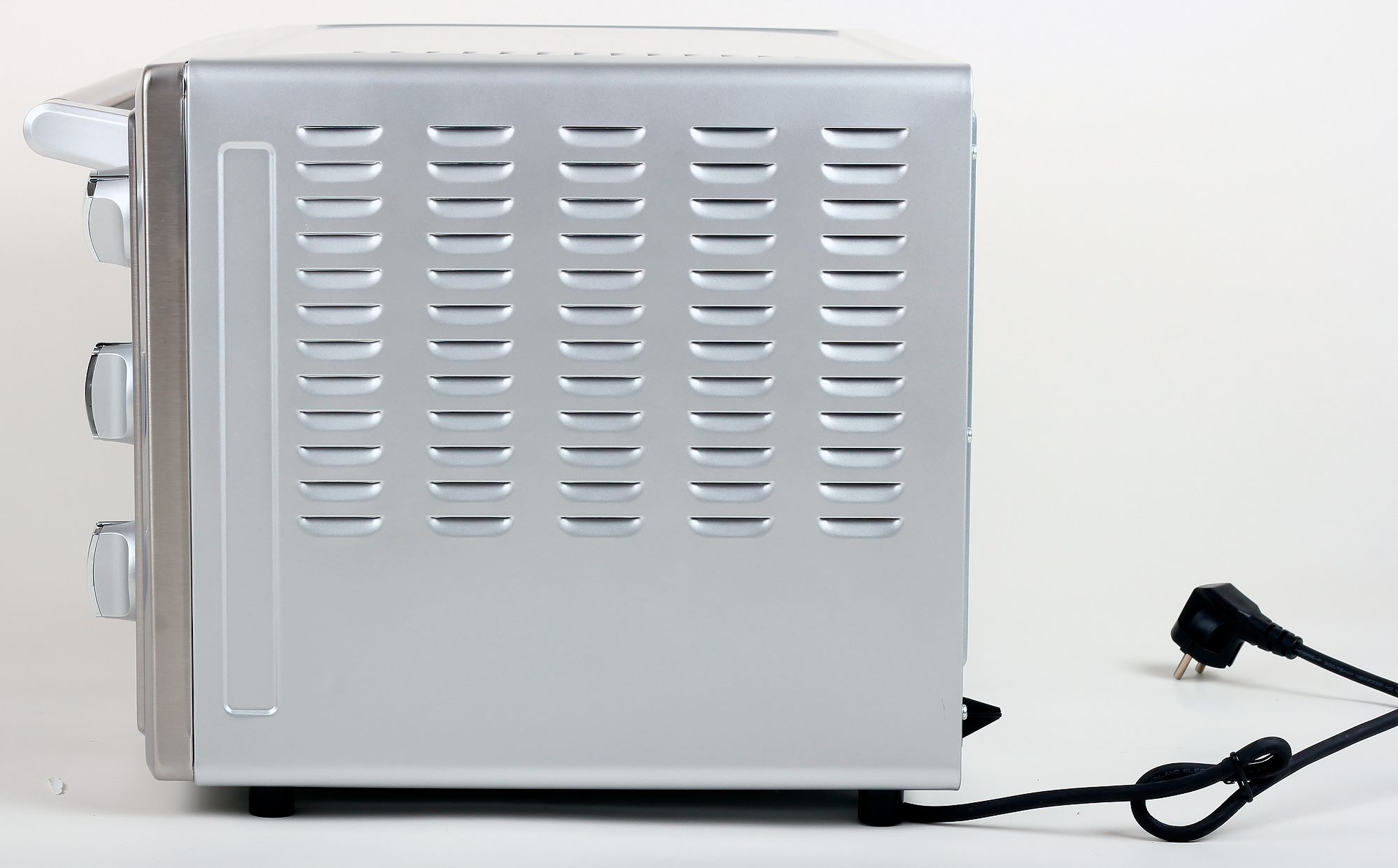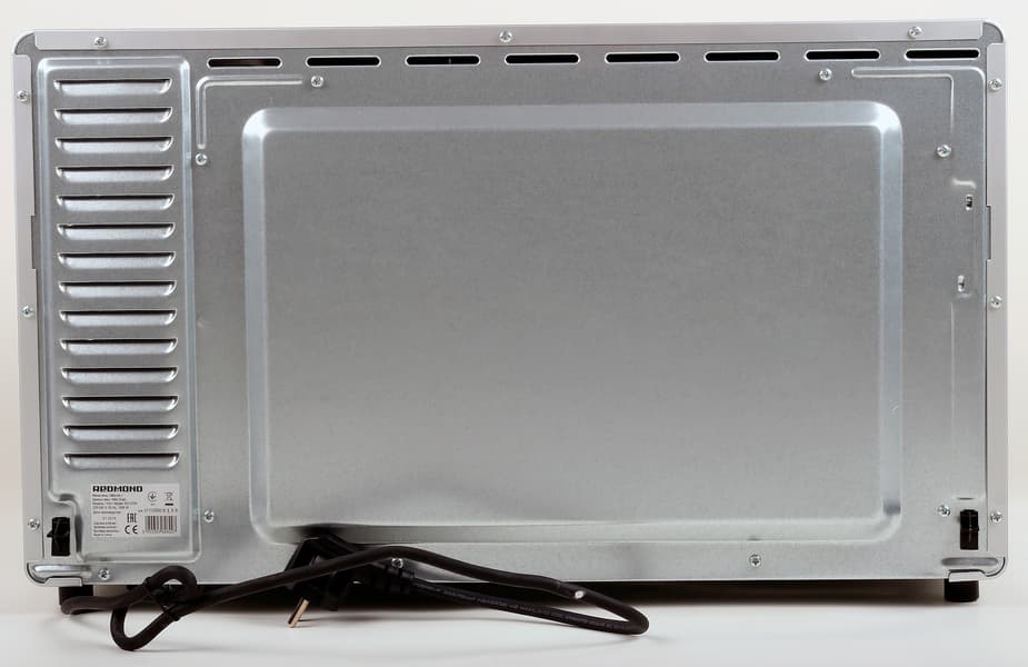 Нижняя панель тоже с вентиляцией, ножками, на которых достаточно прочно и устойчиво стоит мини-печь, и выходом шнура питания. Нам такое расположение шнура не показалось достаточно безопасным, так как при длительной эксплуатации он может перетереться, и его легко повредить при перемещениях мини-печи с места на место.