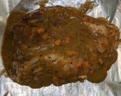 Результат: нежное сочное мясо, равномерно запеченное со всех сторон, и много ароматного сока в фольге.
