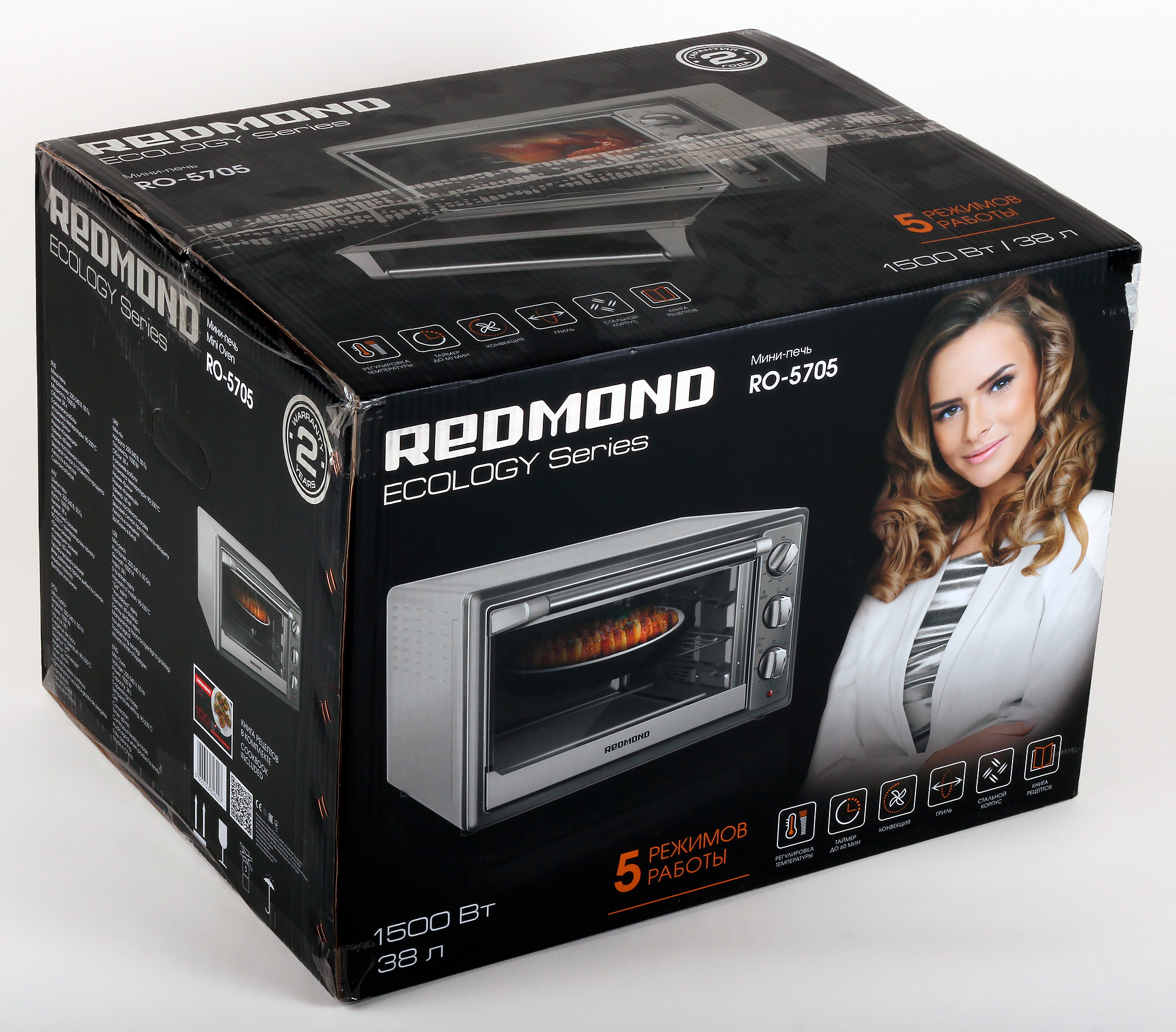 Коробка стандартного для компании Redmond черного цвета выполнена из глянцевого картона. На верхней плоскости изображена мини-печь, крупно написано название модели и выделен срок гарантии — 2 года. Указаны также объем печи (38 литров) и напряжение — 1500 Вт. Это противоречит описанию модели на сайте, где указано, что мощность 1400 Вт, но соответствует инструкции. Так что поверим коробке и инструкции.