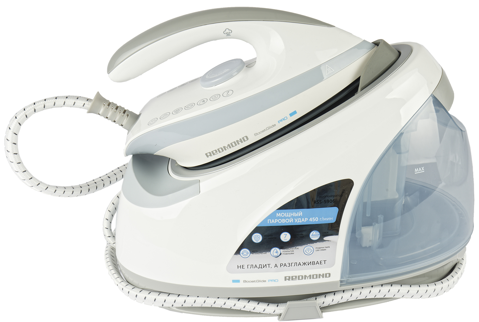 Бойлерный парогенератор Redmond RSS-5906 мощностью 2400 Вт оснащен режимом постоянной подачи пара в 130 г/мин и функцией парового удара в 450 г/мин для мгновенного смягчения и распрямления волокон трудно поддающихся глажке сильно измятых тканей.