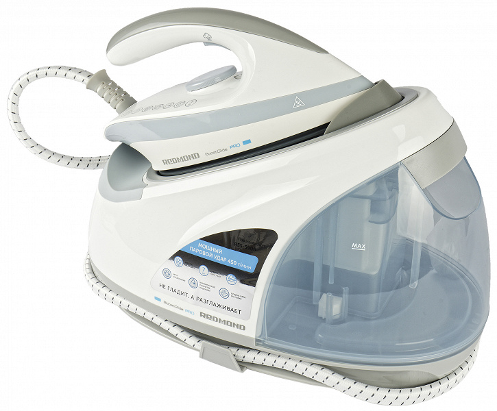 Redmond RSS-5906 подходит как для сухого глажения, так и для глажения с отпариванием. Короткий выброс пара происходит путем нажатия на кнопку с внутренней стороны ручки утюга.