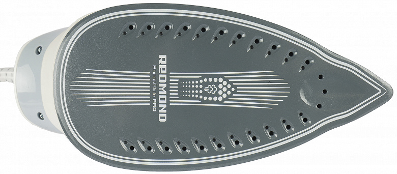 Подошва утюга с антипригарным керамическим покрытием имеет каплевидную форму с зауженной вершиной. Отверстия выхода пара расположены в один ряд вдоль боковых граней подошвы, с тремя отверстиями в вершине.