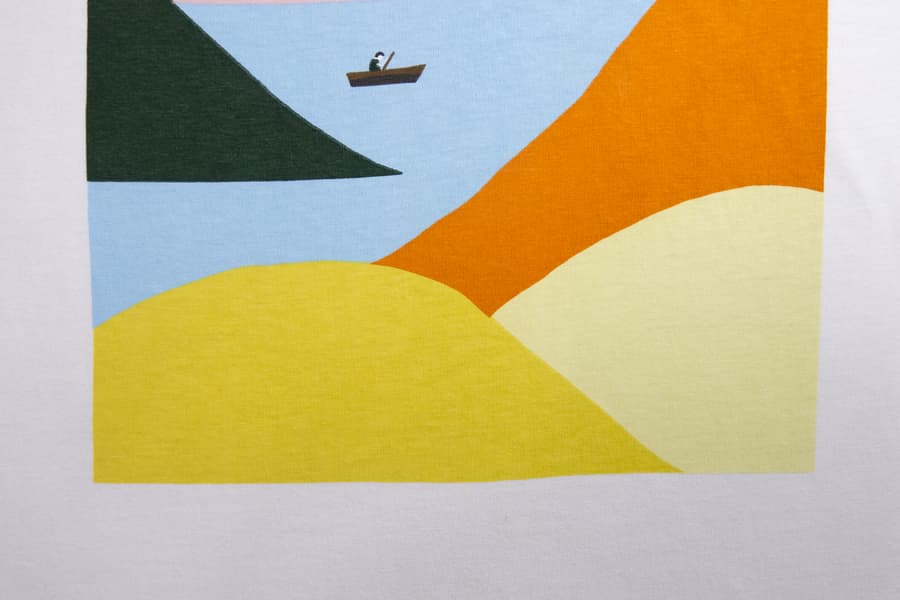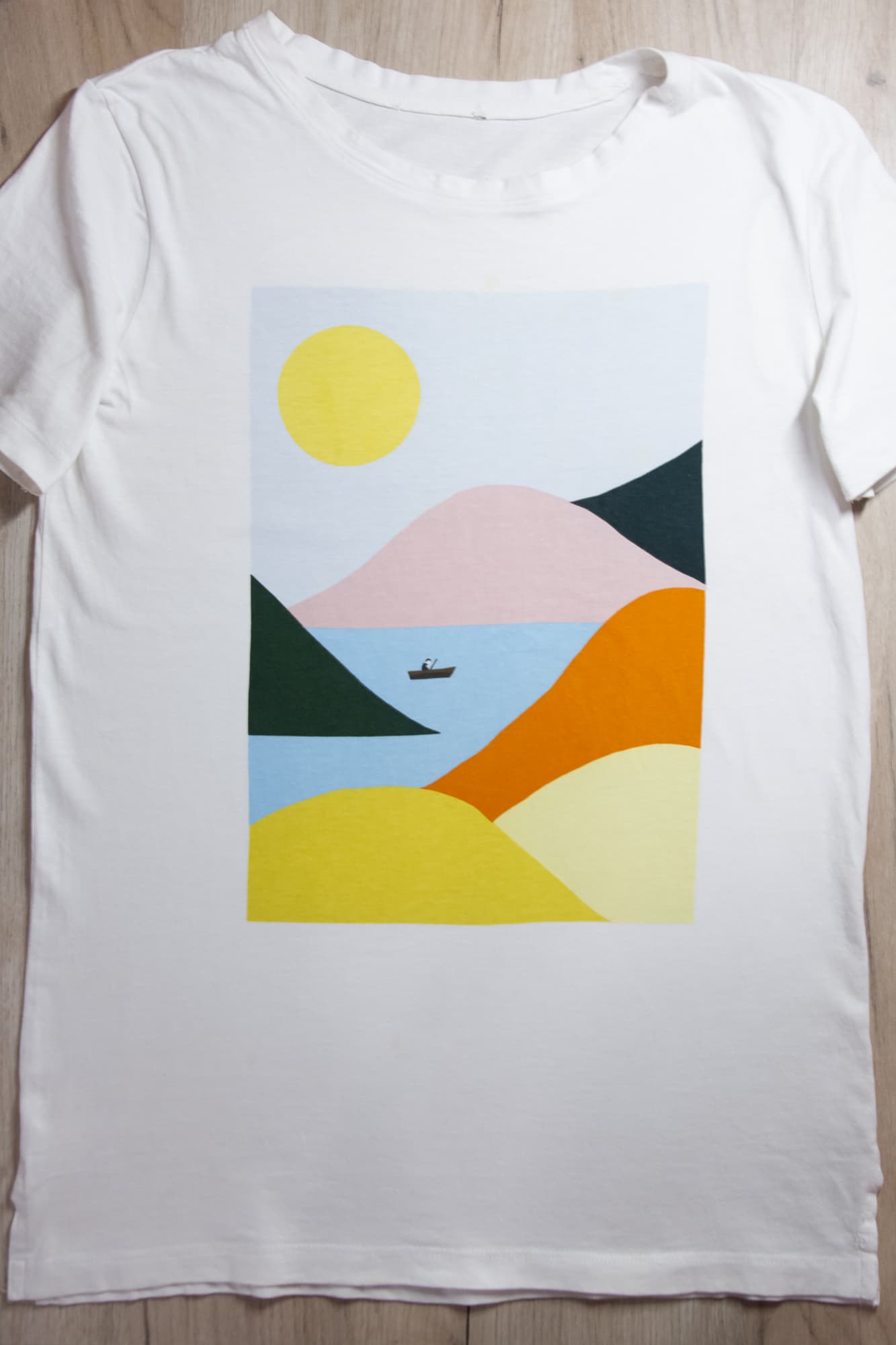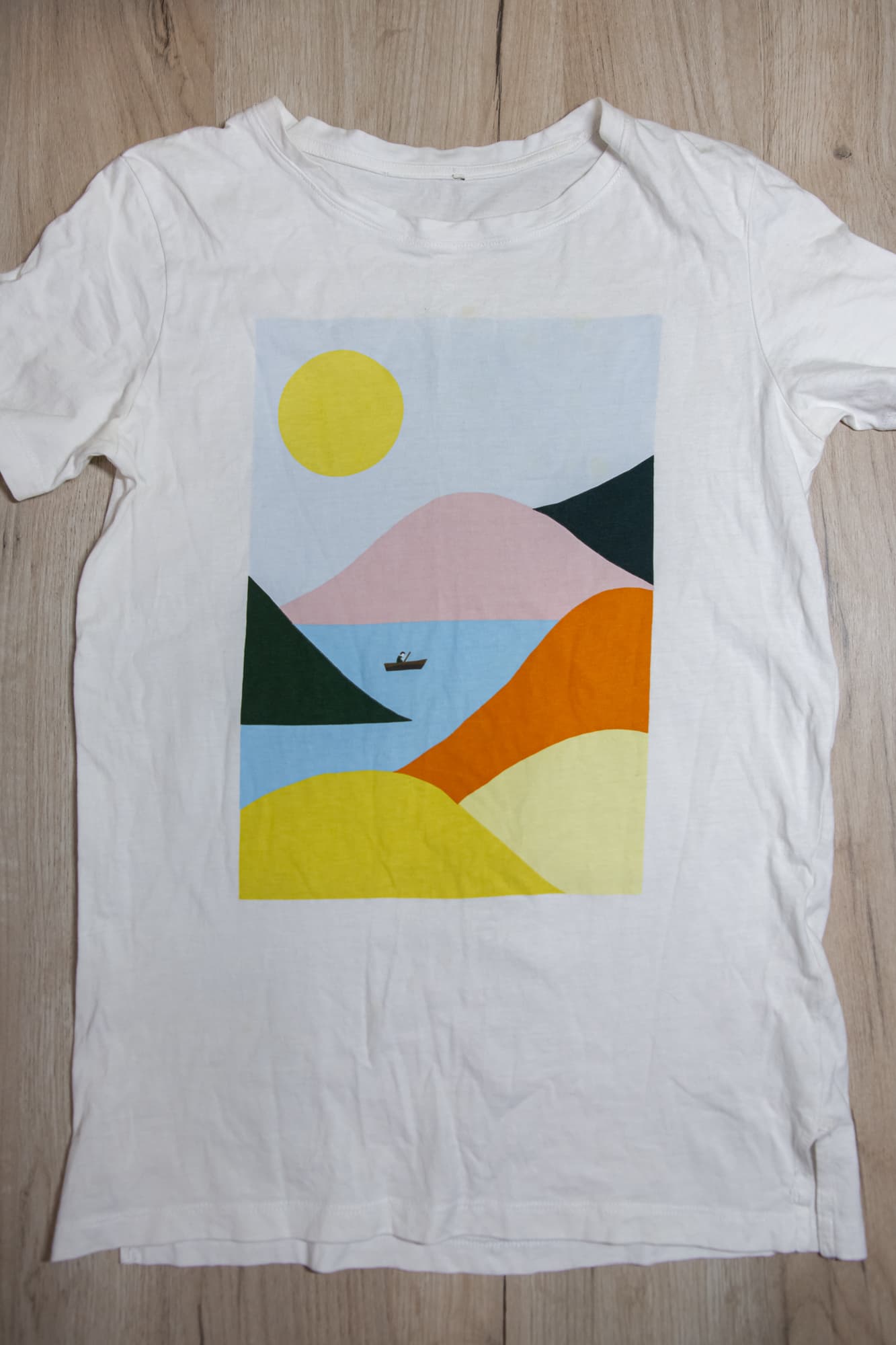 В первом тестовом задании с мятой хлопчатобумажной футболкой нам было важно оценить эффективность парогенератора на минимальной температуре нагрева утюга при периодической подаче пара на средней мощности, а также поведение принта при воздействии на него высоких температур. Изделие обрабатывалось с лицевой стороны.