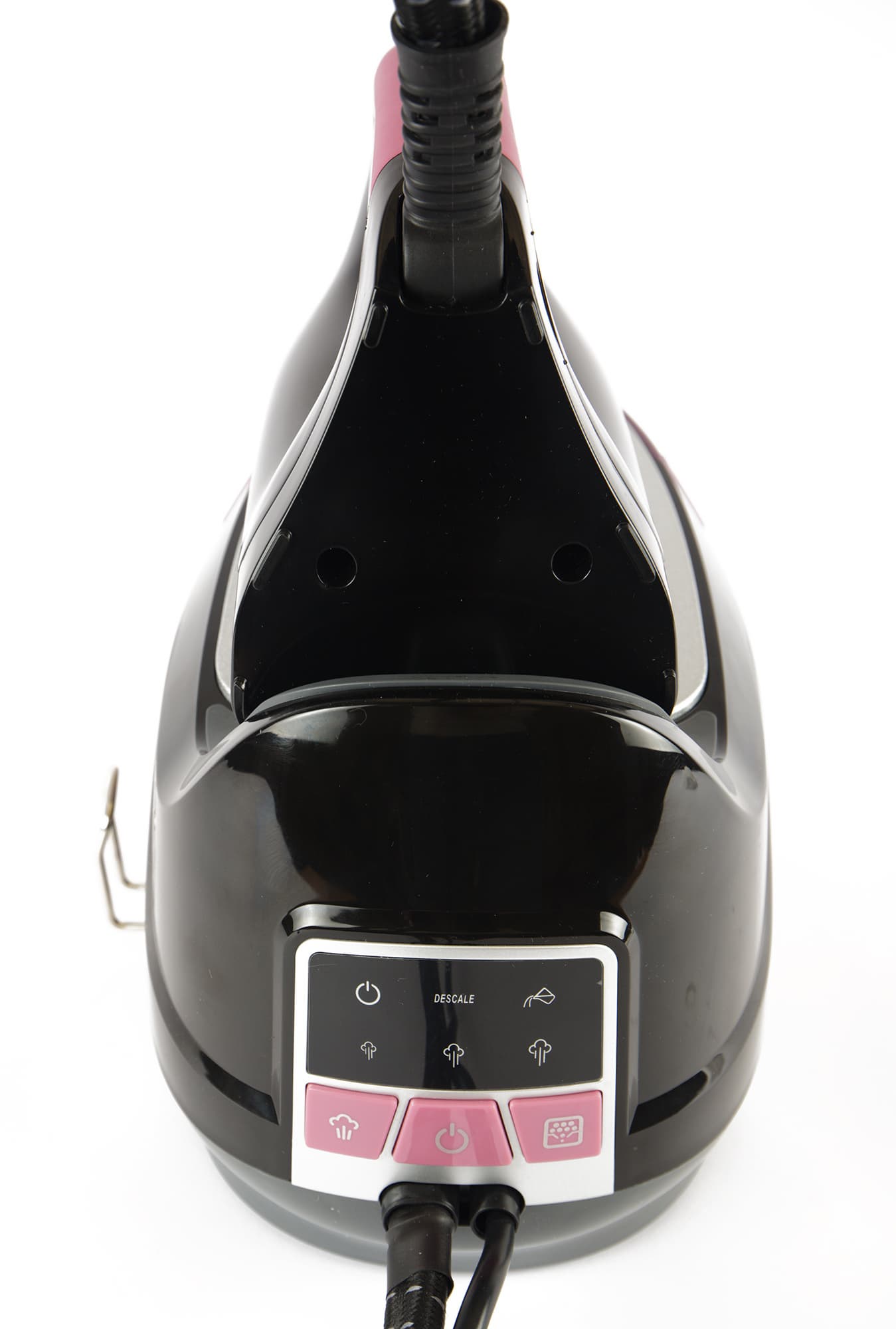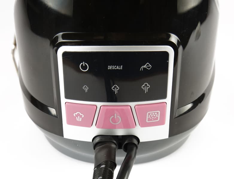 Панель управления с кнопками и светодиодными индикаторами располагается на задней части корпуса паровой станции, внизу. Под ней — место соединения базы со шлангом подачи пара и шнуром электропитания.