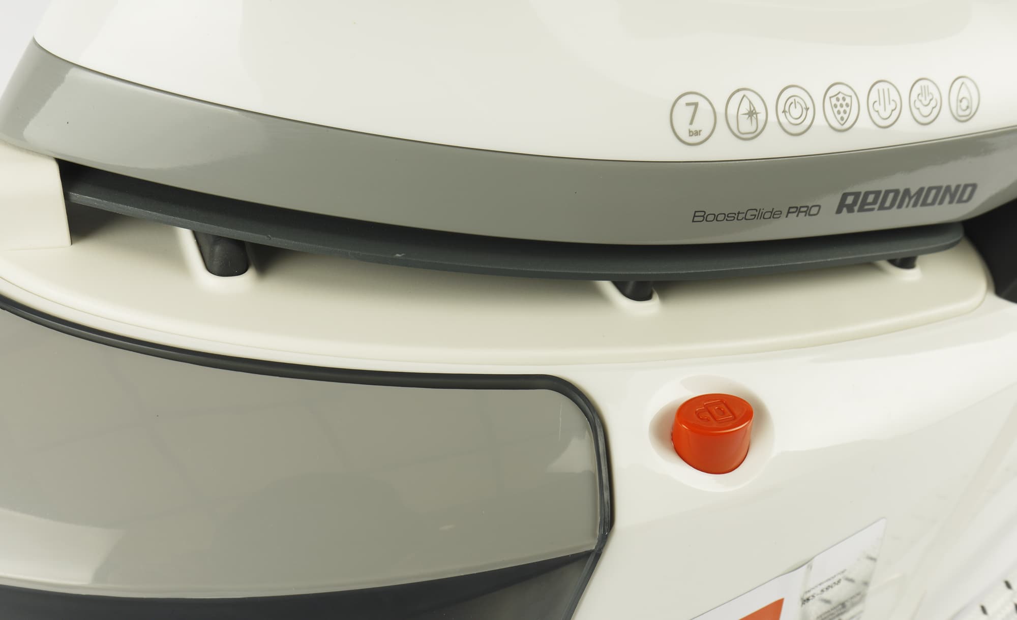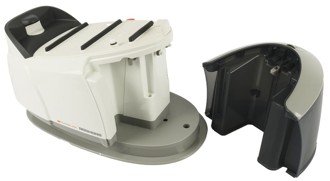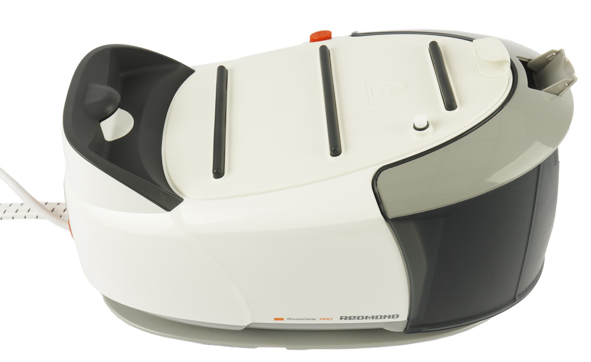 Корпус Redmond RSS-5908 покрыт глянцевым пластиком бело-серой расцветки. Немногочисленные элементы управления и прорезиненная вставка на ручке выделены оранжевым. Нейтральный спокойный дизайн прибора смотрится аккуратно и очень симпатично.