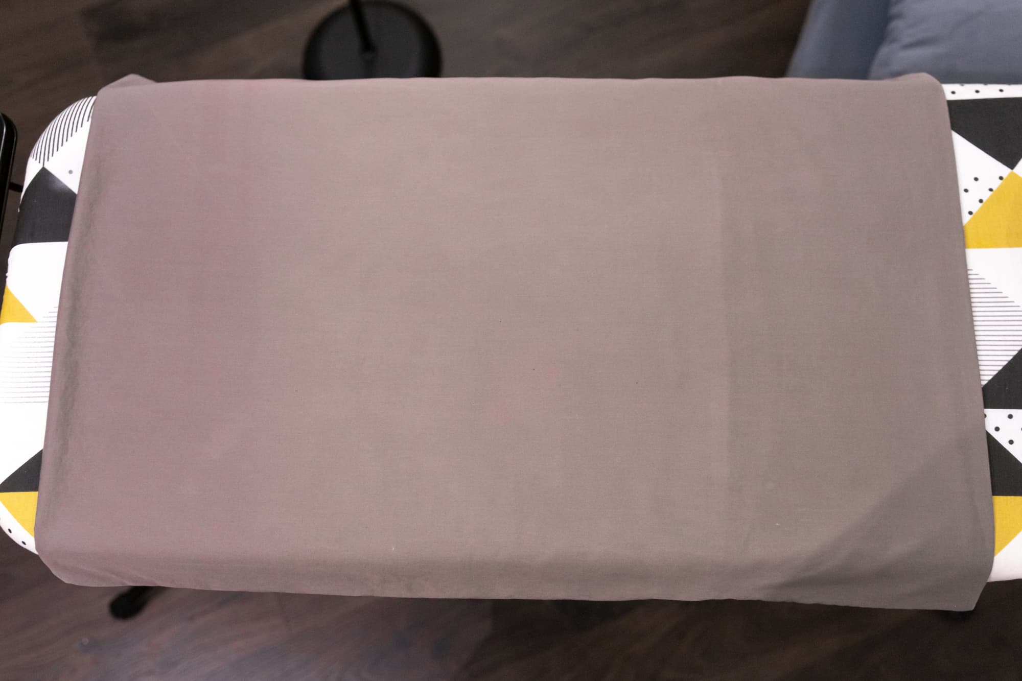 Мы проводили утюгом, слегка касаясь ткани снизу вверх, убрав таким образом все складки. Обработка паром подняла ворс и качественно выровняла поверхность плотного материала.