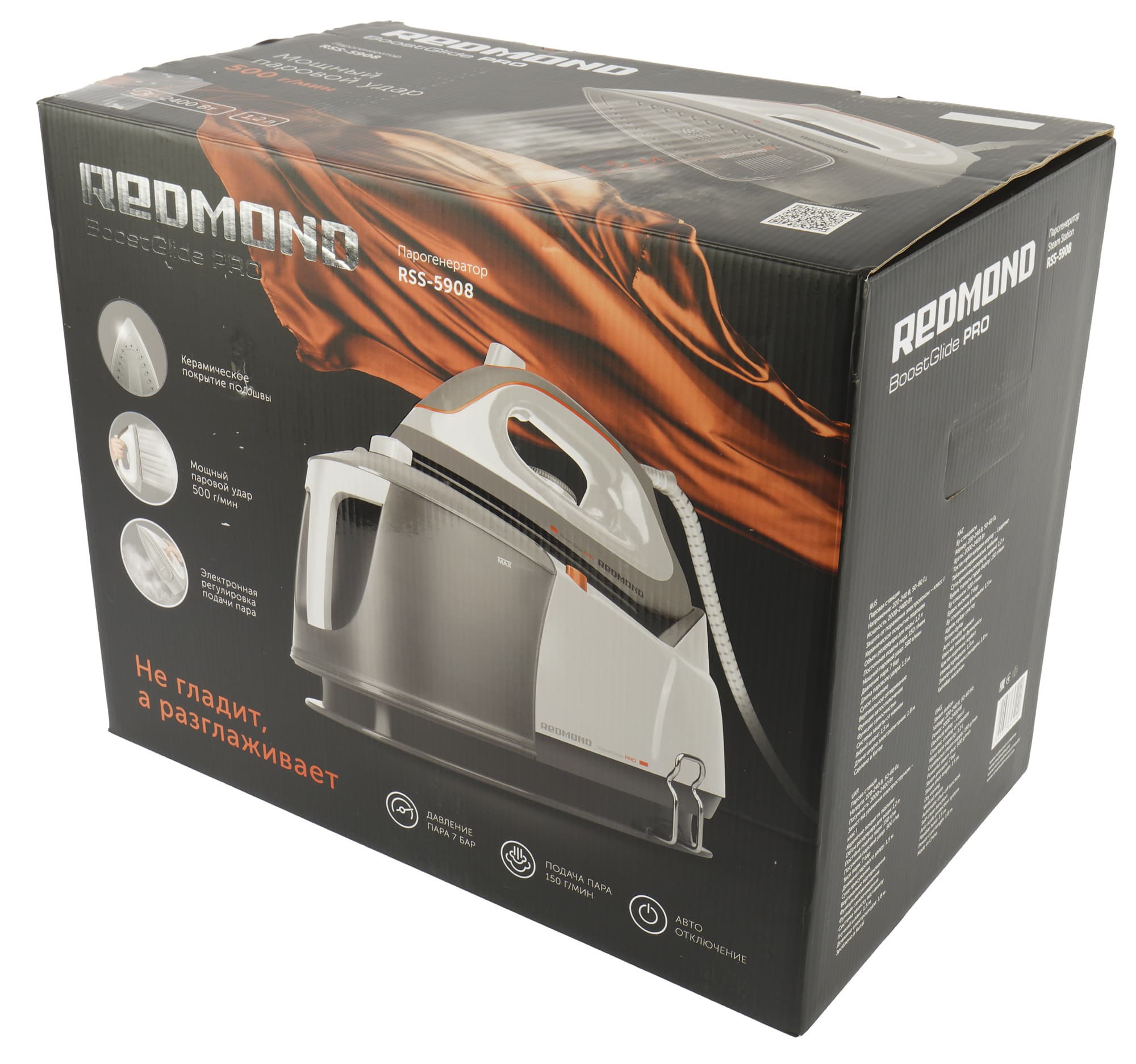 Парогенератор упакован в большую красивую коробку, оформленную в фирменной стилистике Redmond. На гранях упаковки размещены фотографии устройства, логотип компании, полное название модели, описание ее ключевых особенностей и краткий список технических характеристик.