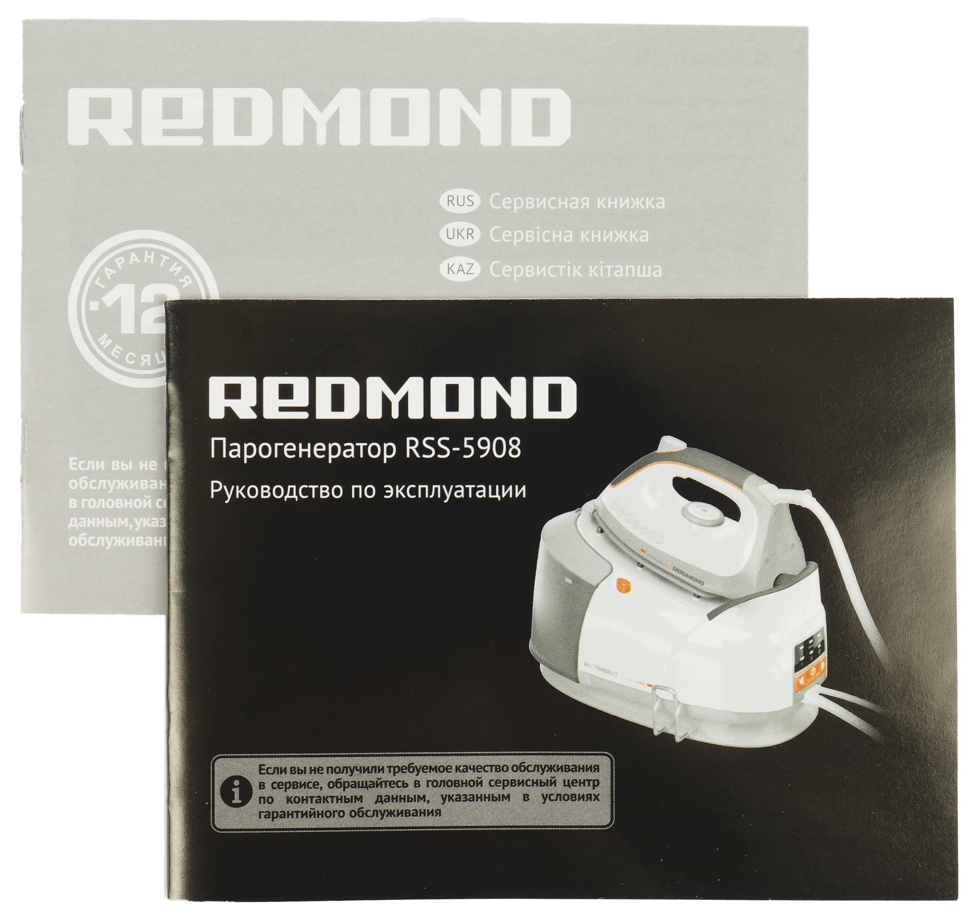 В комплект Redmond RSS-5908 входят: паровая станция с присоединенным к ней утюгом, инструкция и гарантийный талон.