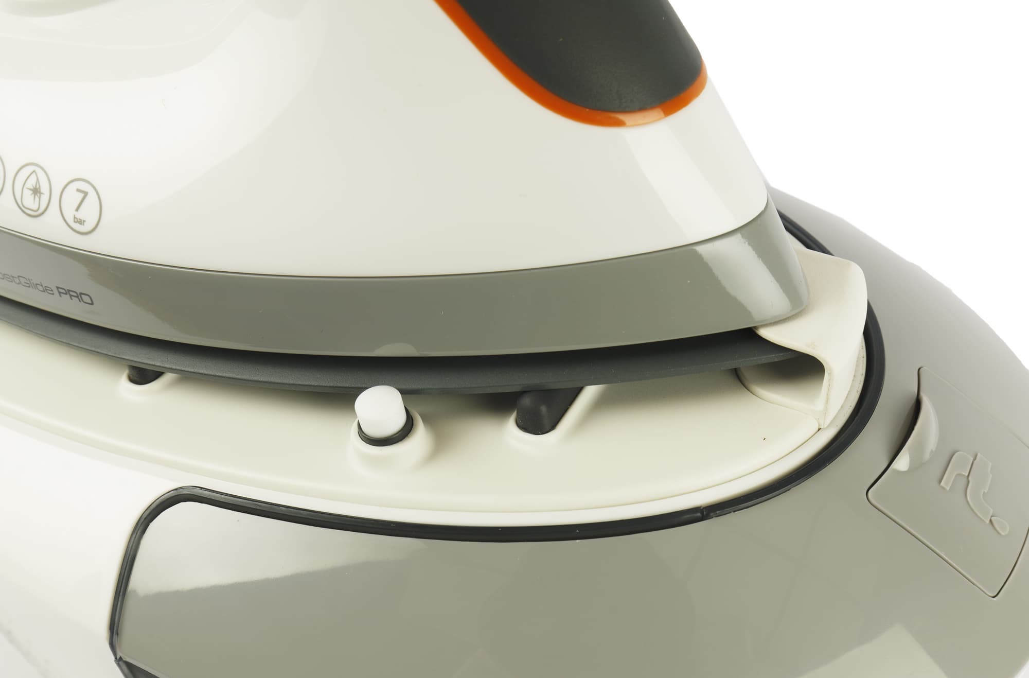 Носик при этом удерживается еще одним выступом и кнопкой-фиксатором сбоку. Для снятия утюга нужно нажать другую, оранжевую кнопку на корпусе базы (она опустит фиксатор) и, удерживая ее, сдвинуть утюг вправо.