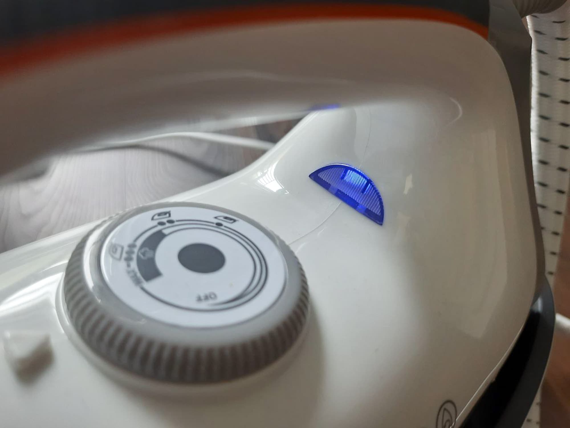 Под ней на корпусе утюга размещено колесо-регулятор нагрева подошвы, а рядом — индикатор нагрева. Колесо крутится тактово со щелчками.