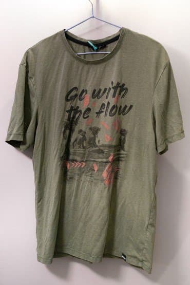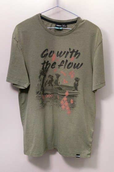 Начинаем традиционно, с мятой хлопчатобумажной футболки. На изделии есть принт и по правилам гладить ее полагается с изнаночной стороны, но мы делали это с лицевой. Утюг включили на максимальный нагрев, а паром вообще решили не пользоваться. Несколько движений и футболка полностью разглажена. Принт не пострадал.