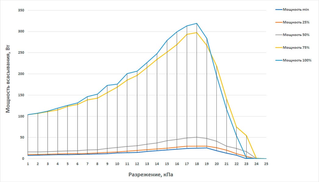 Мощность всасывания (что это такое и как мы ее измеряем, описано в отдельной статье) мы определяли при работе пылесоса без трубы и насадок. Зависимость мощности всасывания от создаваемого разрежения приведена на графике ниже: