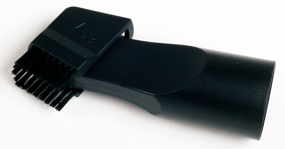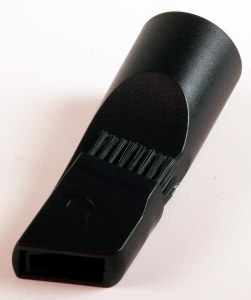 Щелевая насадка также выполнена из черного пластика, приятного на ощупь, и имеет два положения: сложенное, со щетинками по обе стороны тела насадки и полностью свободным отверстием всасывания, и разложенное, в котором «головка» насадки разворачивается на 90 градусов и образует щетку, как видно на фотографии. В сложенном состоянии длина насадки 110 мм, в «щеточном» — на сантиметр больше.