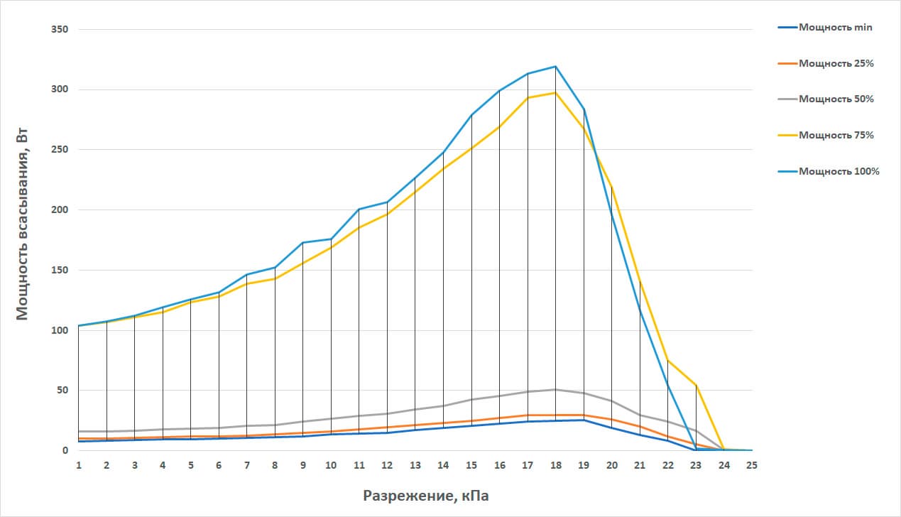 В первой точке, где разрежение минимальное, задвижка на стенде полностью открыта и сопротивление стенда потоку воздуха минимальное. В последней точке заслонка закрыта и мощность всасывания равна нулю.
