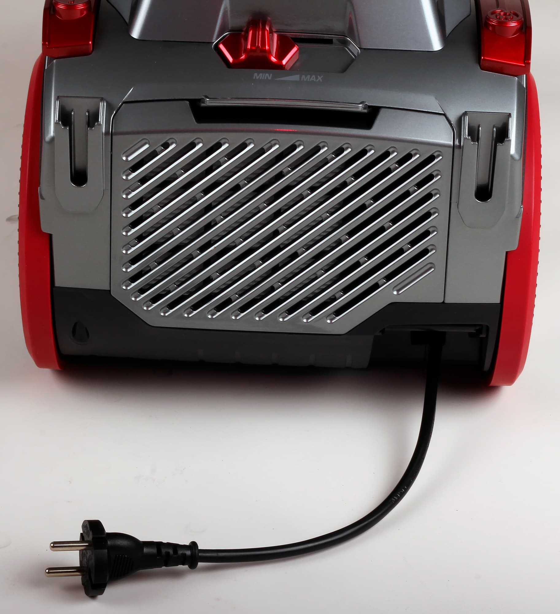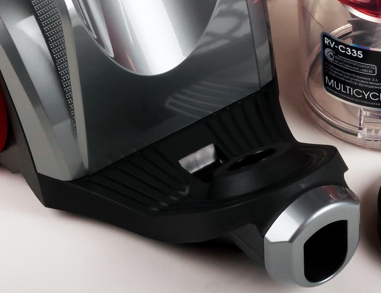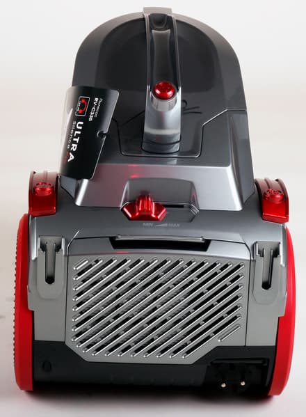 У основания крышки находится четырехпозиционный переключатель мощности — тоже красного цвета. Похоже, к нему придется наклониться не раз в процессе уборки.
