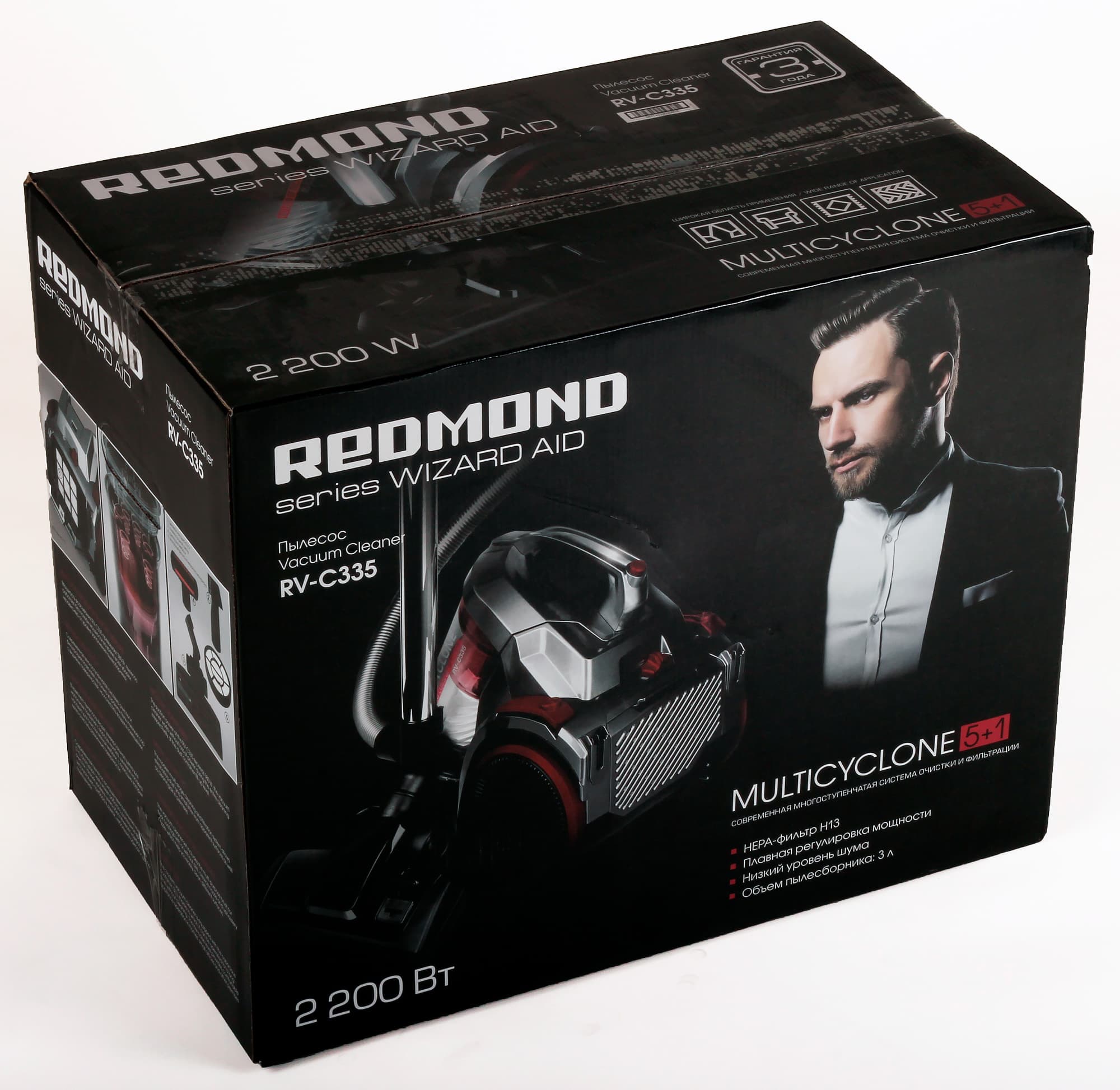 На передней и задней сторонах коробки изображение пылесоса становится более четким и узнаваемым, а рядом с ним появляется джентльмен в белоснежной рубашке и пиджаке, но без галстука. Информация с верхней крышки дублируется, но вместо широкой области применения перечислены достоинства прибора по мнению производителя: HEPA-фильтр H13, плавная регулировка мощности, низкий уровень шума, объем пылесборника 3 литра.