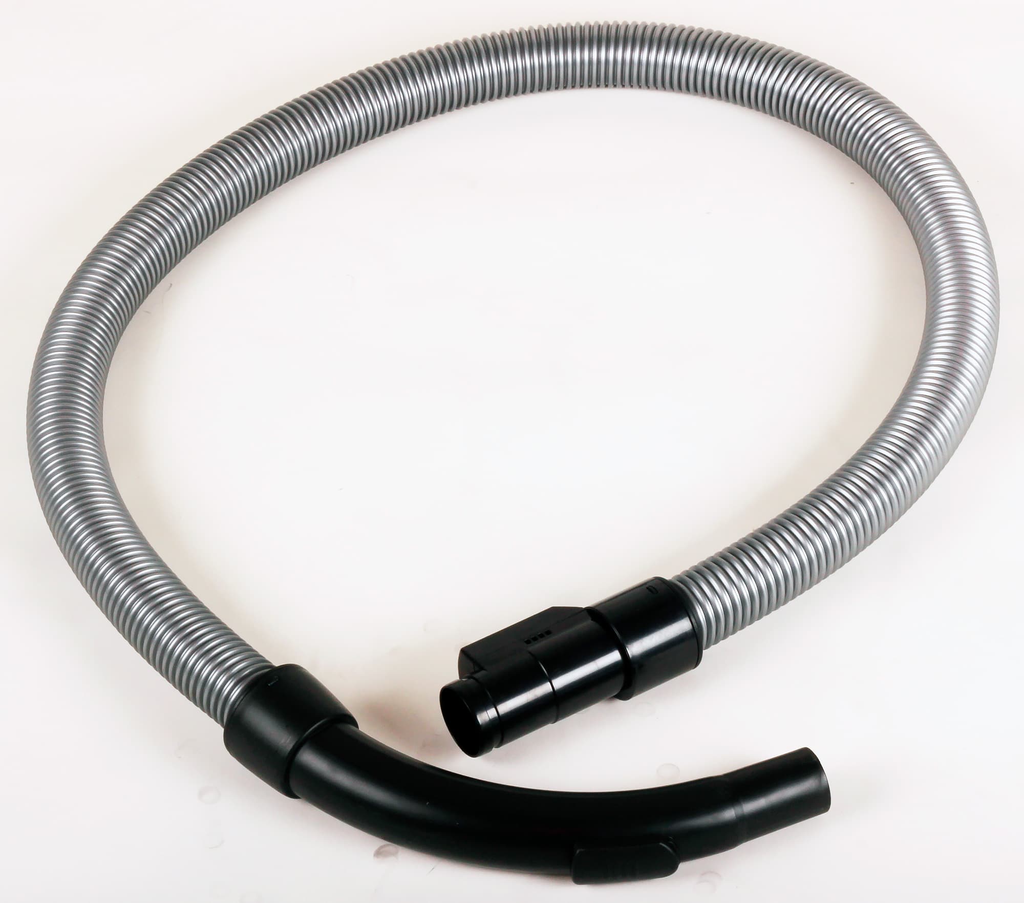 Сам же шланг пылесоса — это пластиковая спирально-гофрированная труба серебристого цвета длиной 175 см и диаметром 4 см. Другой конец шланга представляет собой изогнутую черную ручку из обрезиненного пластика, в которую вставляется труба пылесоса: безо всяких защелок, плотным насаживанием. На этой части шланга также есть клапан для снижения мощности всасывания с двумя предельными положениями: «открыто» и «закрыто». Однако можно сдвинуть этот клапан не полностью, снизив мощность всасывания наполовину.