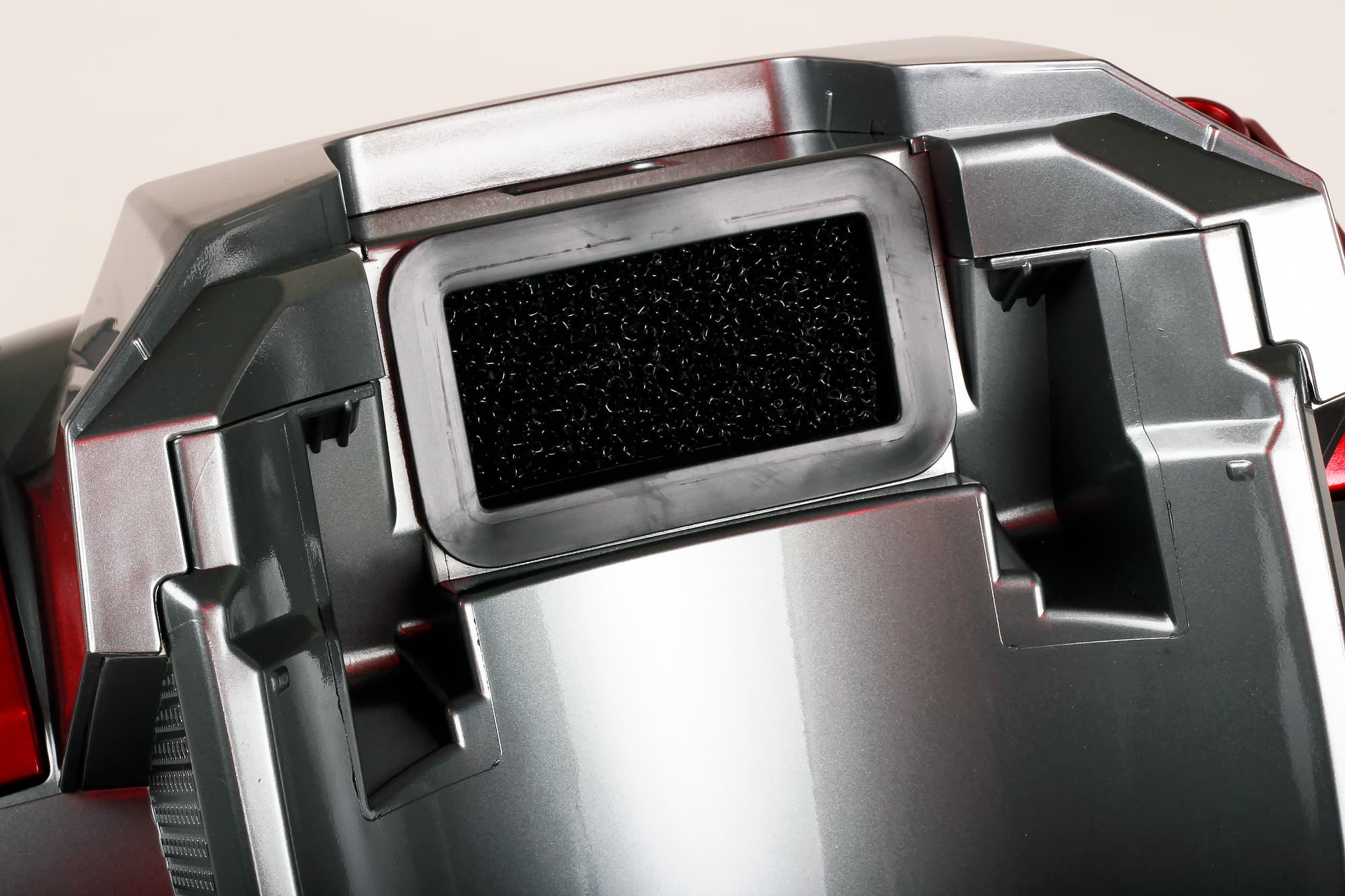 Решетчатая крышка отсека с HEPA-фильтром занимает большую часть задней части пылесоса. Открывается она с некоторым усилием, которое тратится на нажатие специального язычка. А вот защелкивается куда проще — удобнее вектор приложения силы получается.