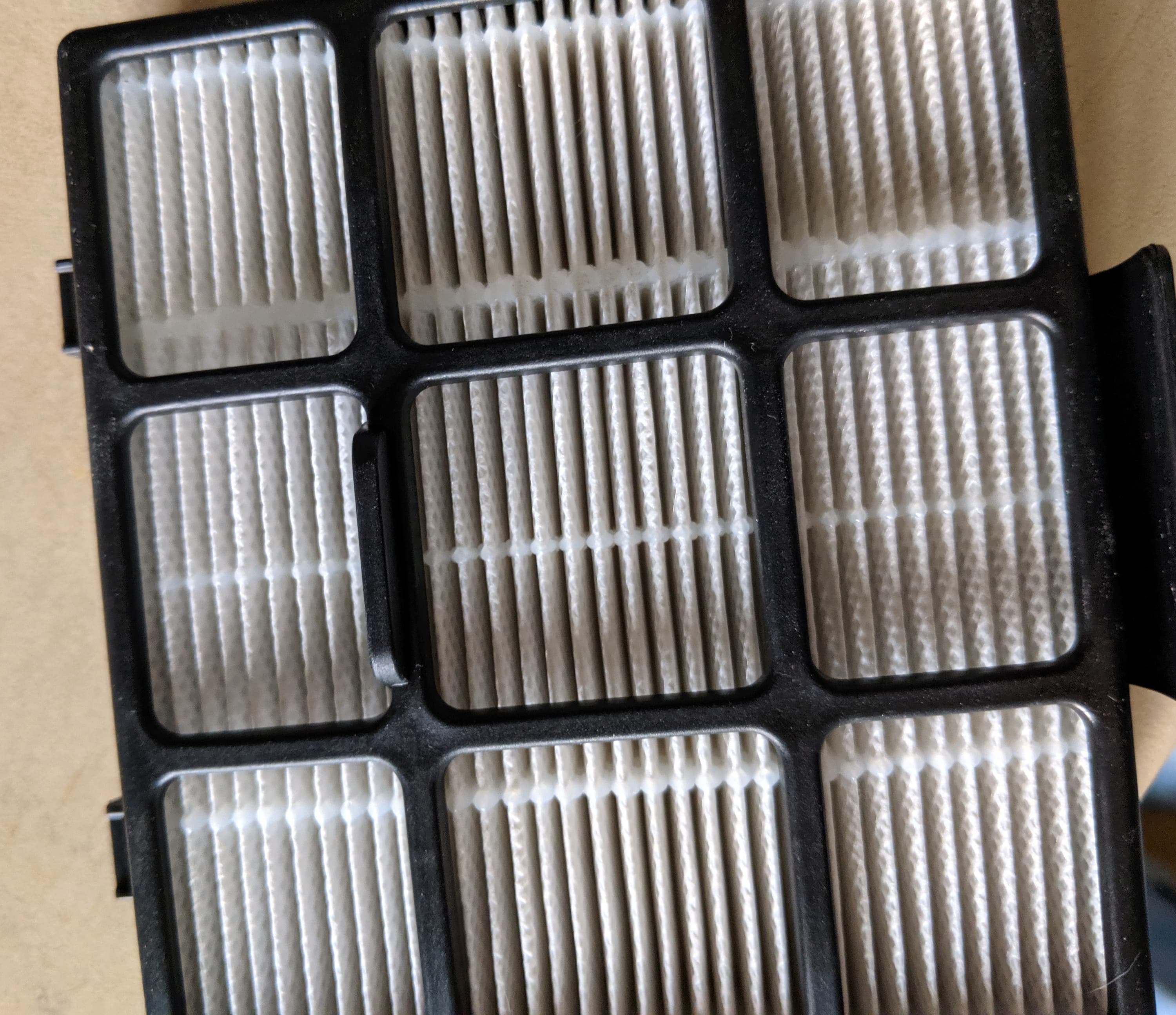 Сам фильтр тоже вынимается за язычок — и тоже с некоторым трудом. Он представляет собой квадратную пластиковую решетку, ячейки которой заполнены фильтрующей поверхностью.