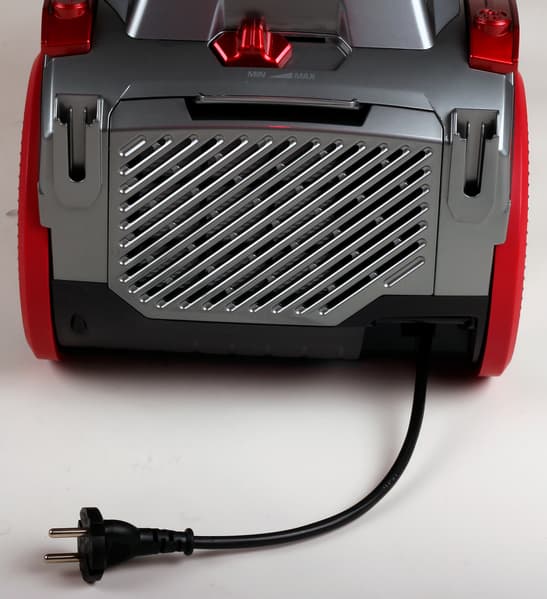 Шнур пылесоса — длиной чуть меньше заявленных 5 метров (но незначительно) — оснащен системой автоматического сматывания. Вытягивается из гнезда на задней части пылесоса легко, фиксируется на выбранной длине четко, сматывается плавным нажатием на кнопку на верхней части пылесоса. К сожалению, обе кнопки красные и одинаковые по форме, так что в процессе эксплуатации неизбежна путаница. Можно было бы кнопку для шнура сделать белой.