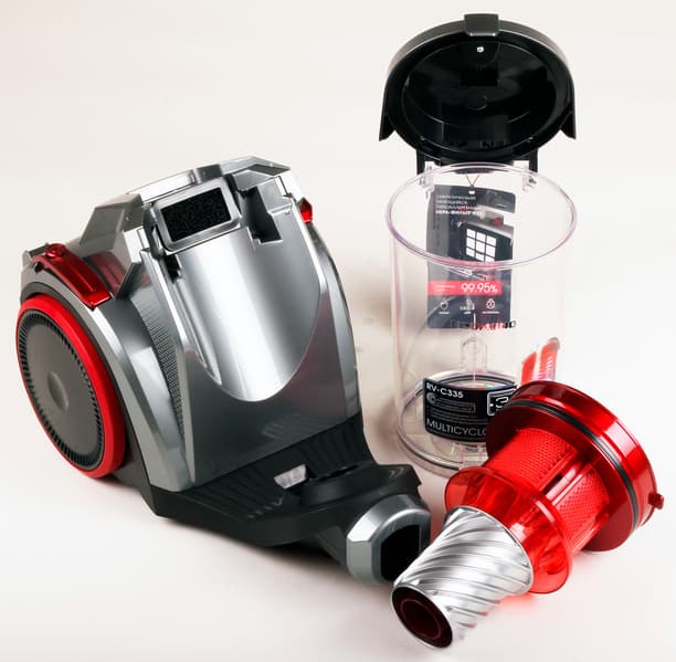 Циклонный фильтр неразборный — по крайней мере, для человека без отвертки. Все его доступные обозрению части сделаны из полупрозрачного красного и прозрачного бесцветного пластика. Он вынимается, если открыть обе крышки пылесборника и толкнуть вперед с торца. Ставится не без проблем: у него есть не очень очевидный язычок, который надо совместить с еще более неочевидным пазом на прозрачной стенке пылесборника. Если этого не сделать, то крышка пылесборника не закрывается. Никаких дополнительных защелок или кнопок, крепящих этот фильтр, мы не нашли.
