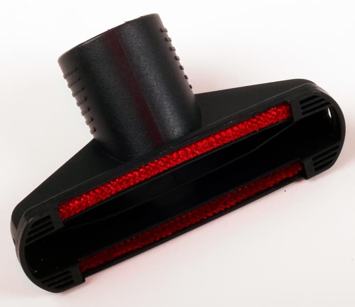 Насадка для мягкой мебели невелика и имеет на рабочей поверхности две вставки из грубого красного бархата. Они собирают на себя пыль, волосы и шерсть с поверхности, поэтому после использования насадку надо чистить отдельно. Ширина насадки 120 мм, высота 40 см.