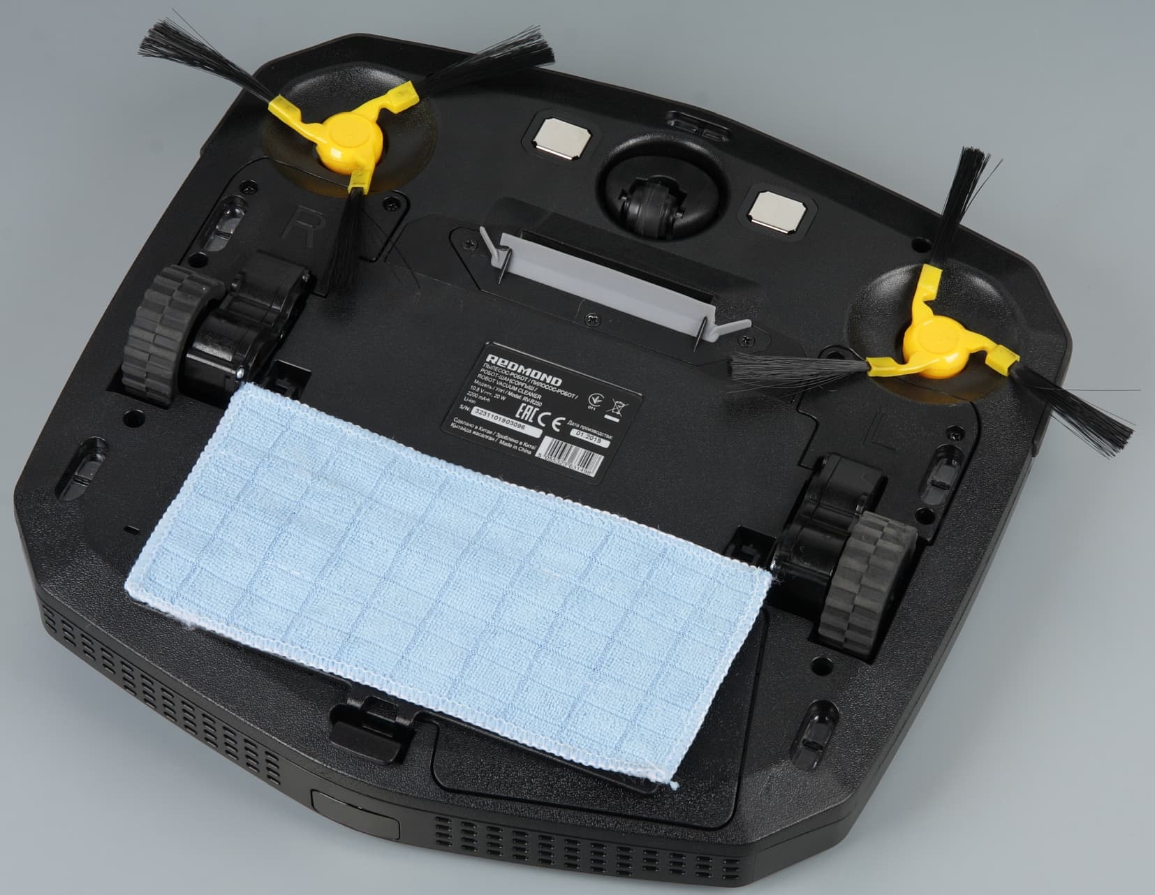 Для этого на днище робота закрепляется протирочная насадка, на которую на липучке прикрепляется махровая салфетка.