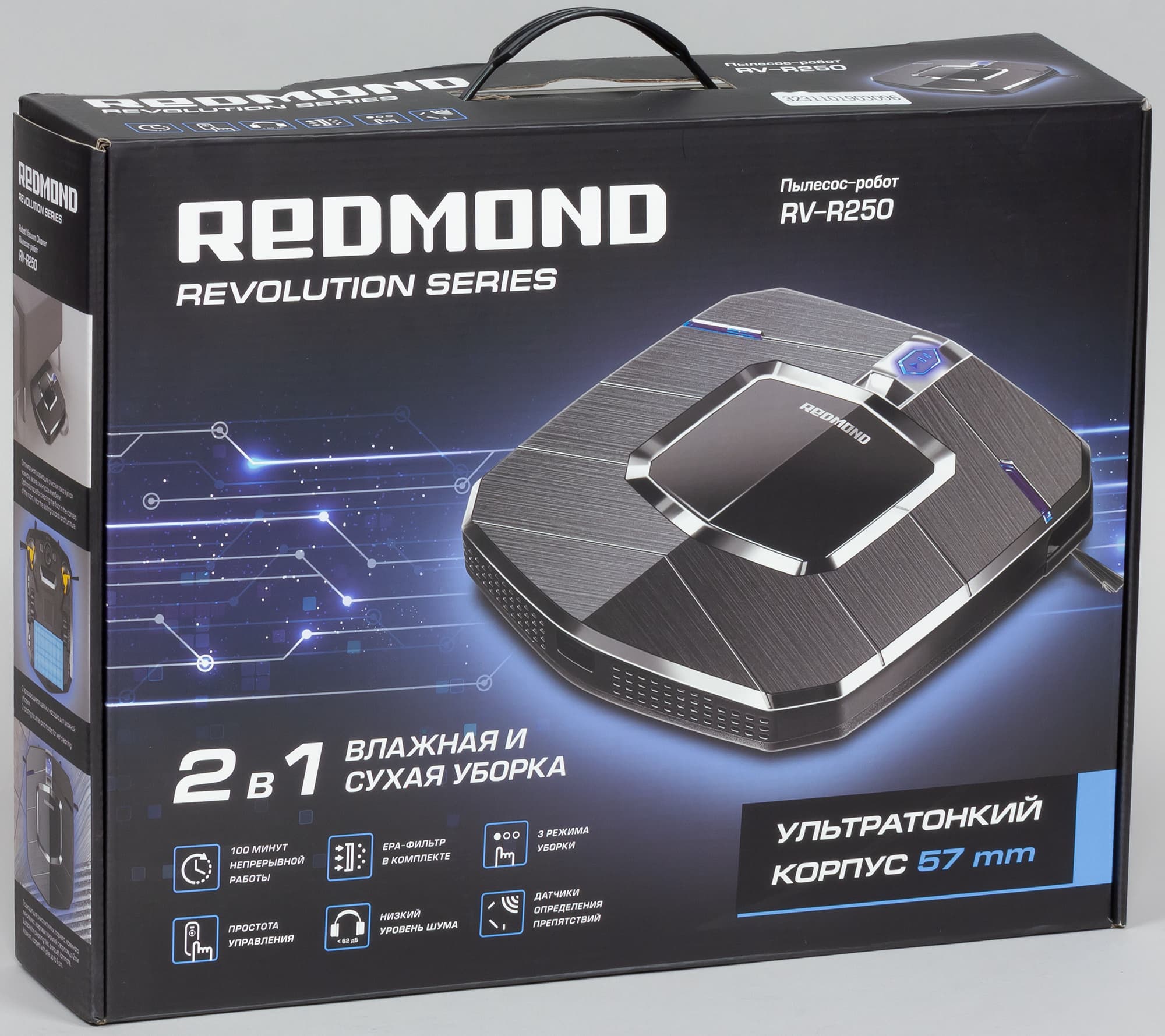 Робот-пылесос Redmond RV-R250 упакован в небольшую красочно оформленную коробку из гофрокартона. На внешних плоскостях коробки есть изображения самого робота, а также перечислены его основные особенности и характеристики. Надписи преимущественно на русском языке. Для защиты и распределения содержимого применяются формы из пенопласта и пластиковые пакеты. Коробка оснащена пластиковой ручкой, поэтому донести покупку до дома будет нетрудно.