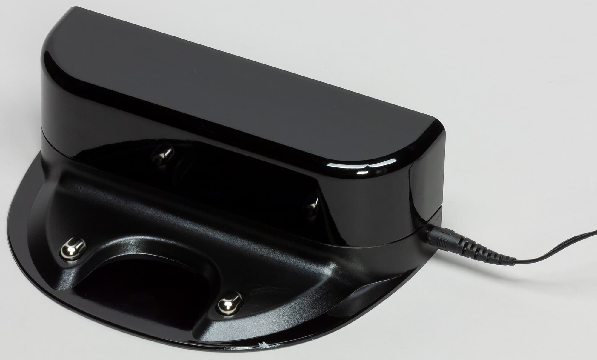 База, на которой пылесос заряжается, имеет относительно большое основание, на которое снизу наклеены две противоскользящие накладки из резины.