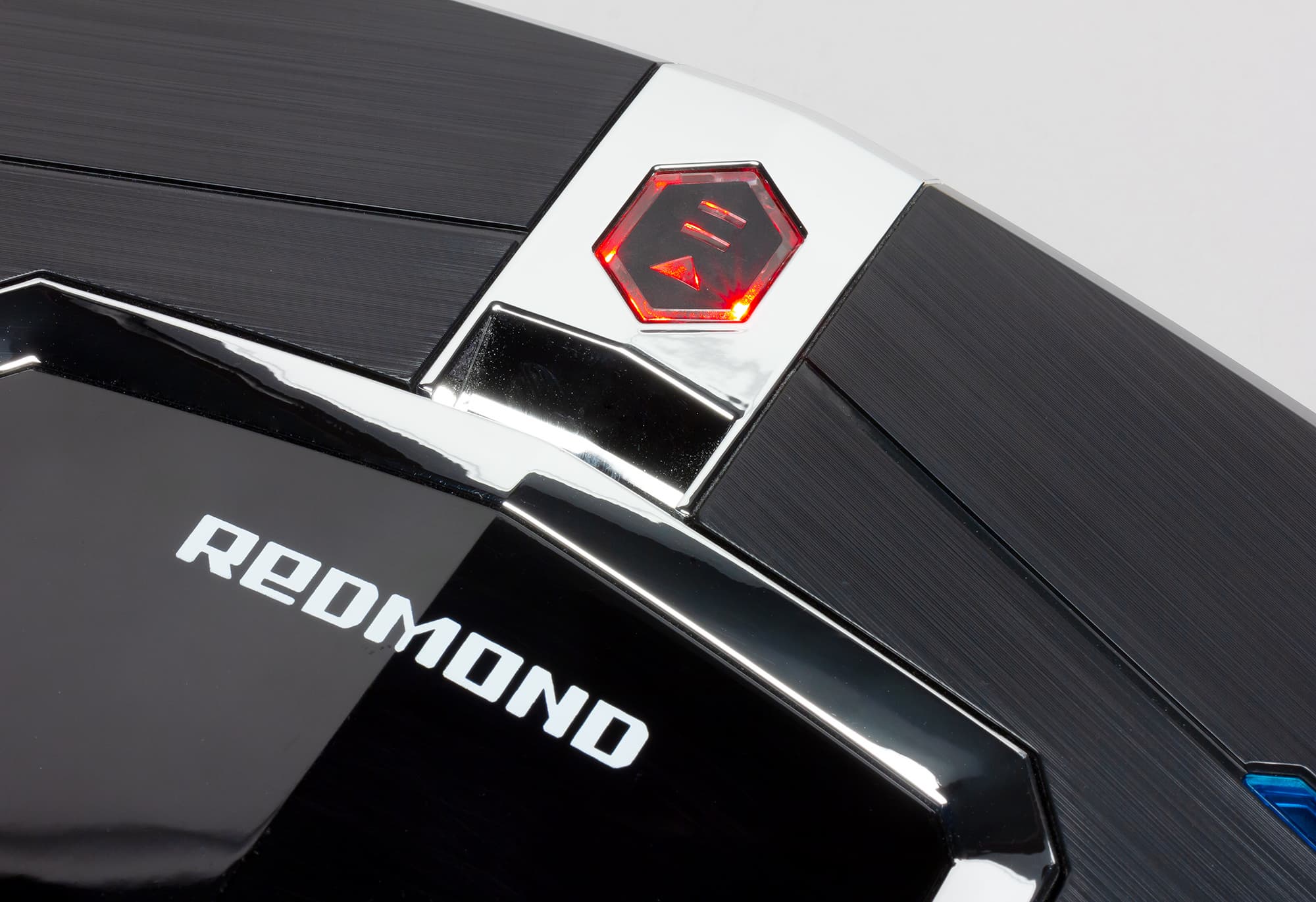 Сверху в передней части есть две вставки из тонированного синим прозрачного пластика, имеющие, видимо, исключительно декоративную функцию. Откидная ручка пылесборника и панель кнопки изготовлены из металлизированного пластика с зеркально-гладкой поверхностью. Сама кнопка изготовлена из прозрачного пластика. Сверху на нее наклеена трафаретная резиновая накладка. Снизу кнопка подсвечивается красным и синим светодиодами.
