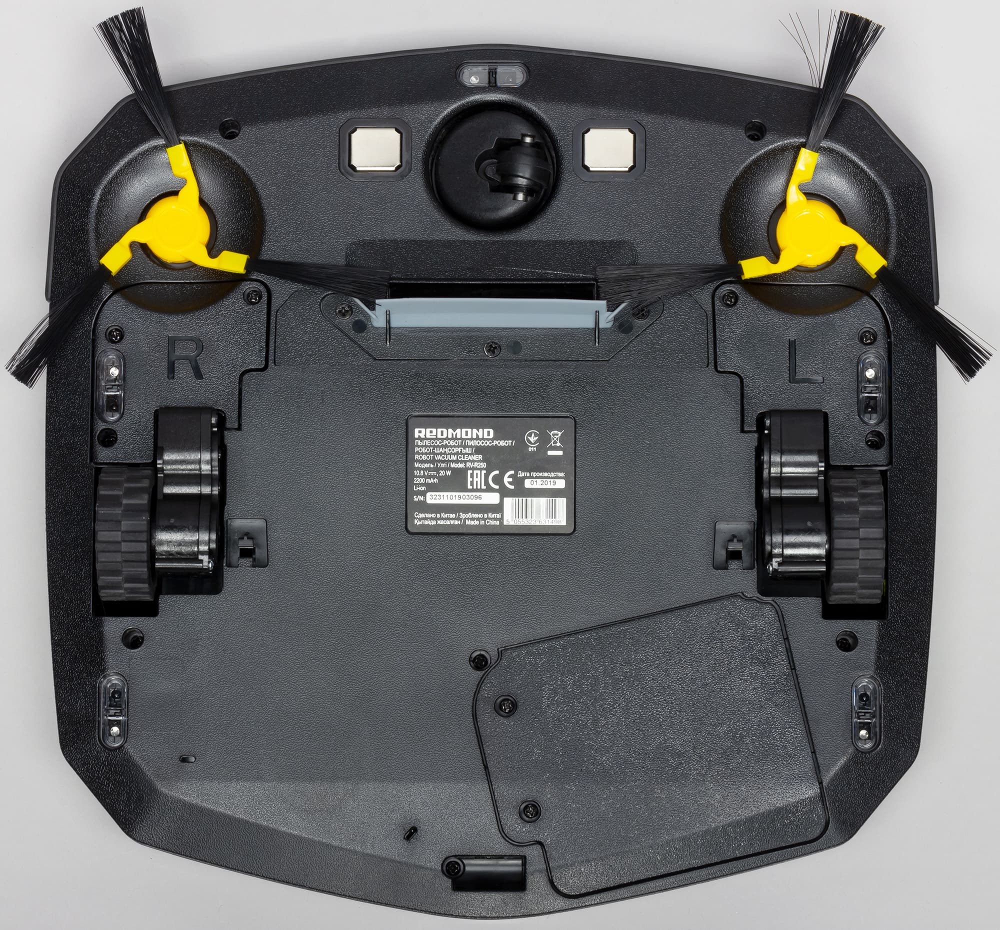 Перевернув пылесос вверх днищем, мы увидим две контактные площадки, передний опорный поворотный ролик (с датчиком вращения), боковые щеточки, всасывающую щель с юбочкой-скребком из упругого пластика, два ведущих колеса на подпружиненных блоках мотор-редукторов и крышку отсека аккумулятора.