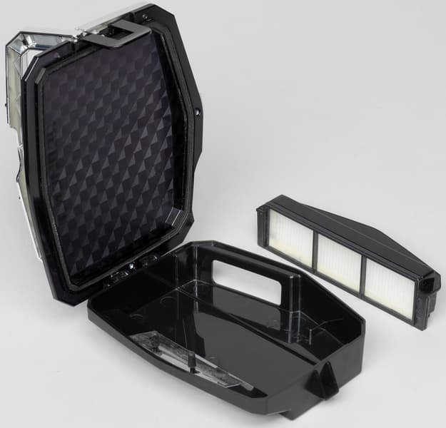 Пылесборник легко вытащить, подцепив край его откидной ручки из углубления на верхней панели. Входное отверстие пылесборника изнутри прикрывает шторка из прозрачного пластика, что чтобы мусор не выпадал в неподходящий момент. Очищать пылесборник очень просто и удобно: откидывается верхняя крышка (она фиксируется на одной защелке), и мусор вытряхивается из контейнера.