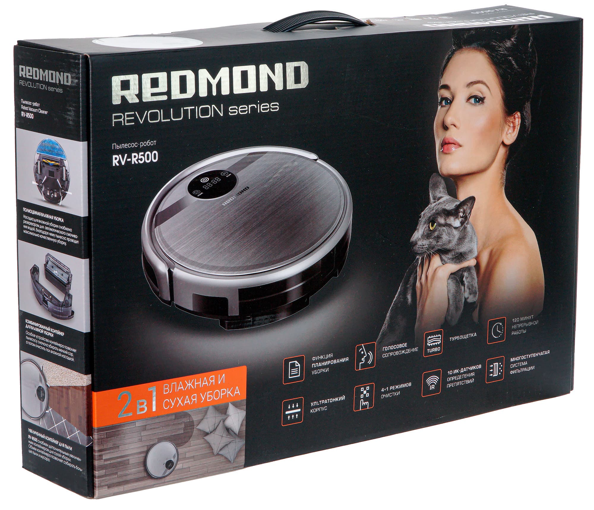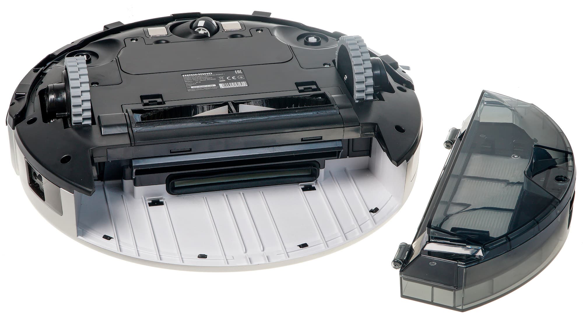 Redmond RV-R500 — типичный представитель класса роботов-пылесосов «два в одном». Этот робот позволяет как пылесосить, так и производить влажную уборку с помощью контейнера для воды и влажной тряпки. При этом режим влажной уборки может использоваться одновременно со сбором твердого мусора.