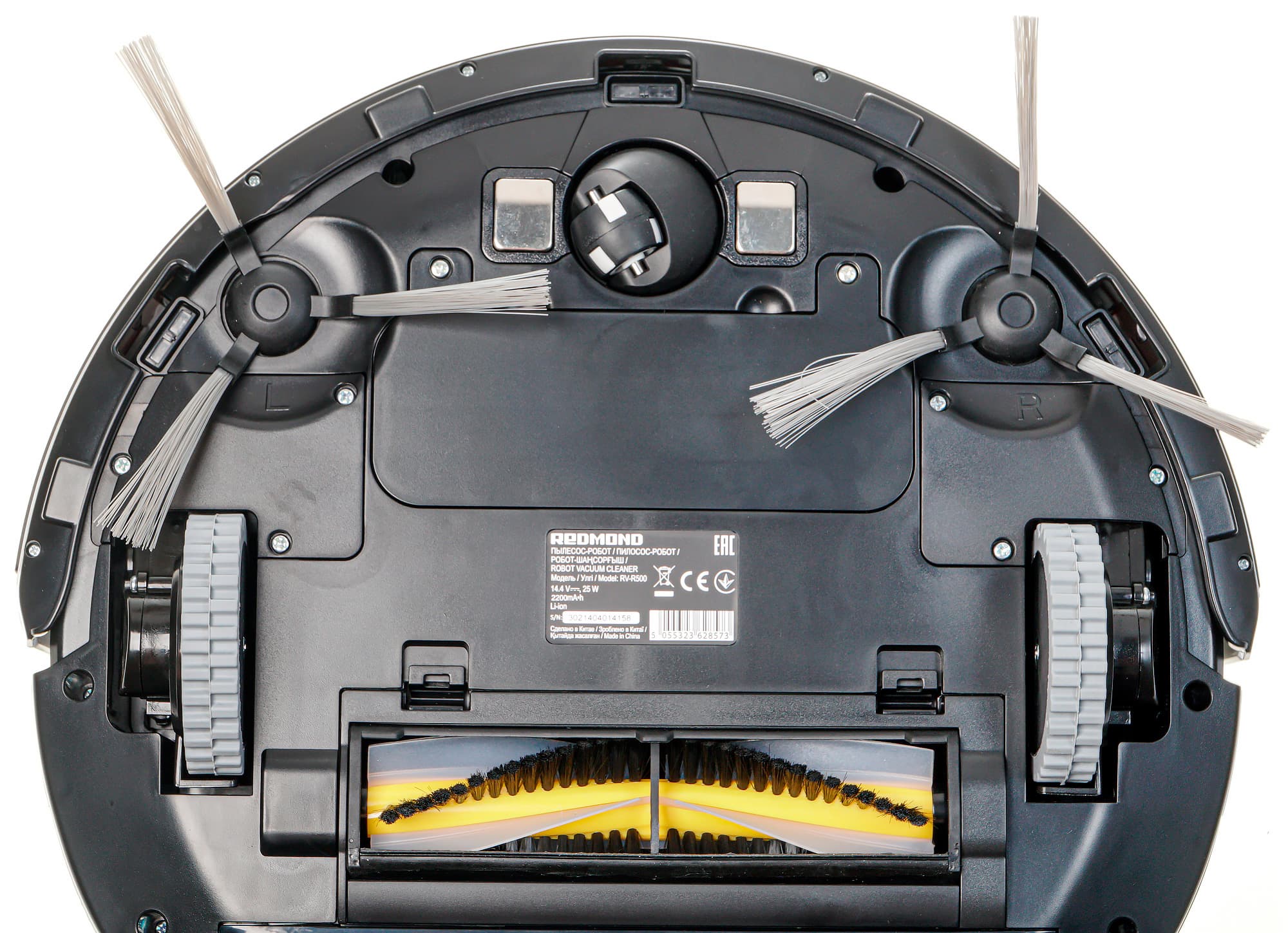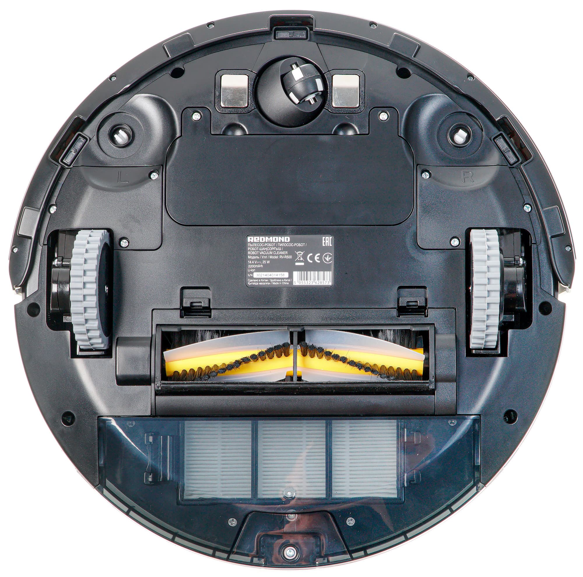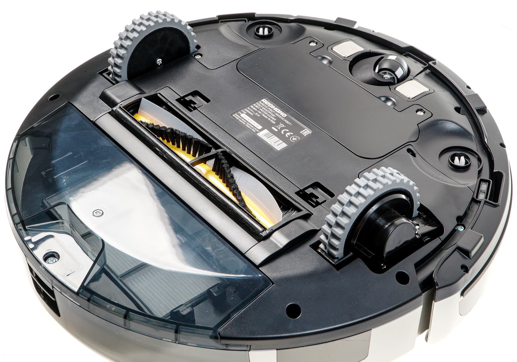 Направляющее колесо — пластиковое. Оно заключено в пластиковую же сферу, допускающую свободное вращение на 360°. По обе стороны от колеса размещаются контакты для зарядки на базе. Также в передней части корпуса можно увидеть гнезда для крепления боковых щеток, а рядом с ними и по центру — окошки оптических (инфракрасных) датчиков поверхности.