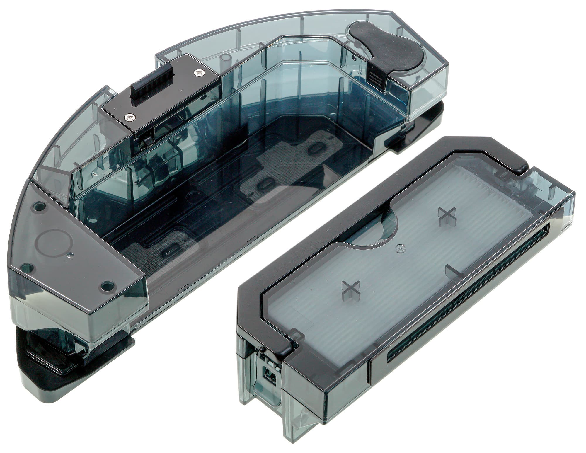 Модули пылесборника и влажной уборки устанавливаются в один и тот же «слот» и фиксируются с помощью защелки-кнопки. Модуль сухой уборки имеет откидную крышку, которая фиксируется с помощью той же самой кнопки-защелки. Под крышкой расположен прямоугольный фильтр тонкой очистки, состоящий из предварительного поролонового и HEPA-элемента. Этот блок крепится с помощью своей собственной пластиковой защелки.