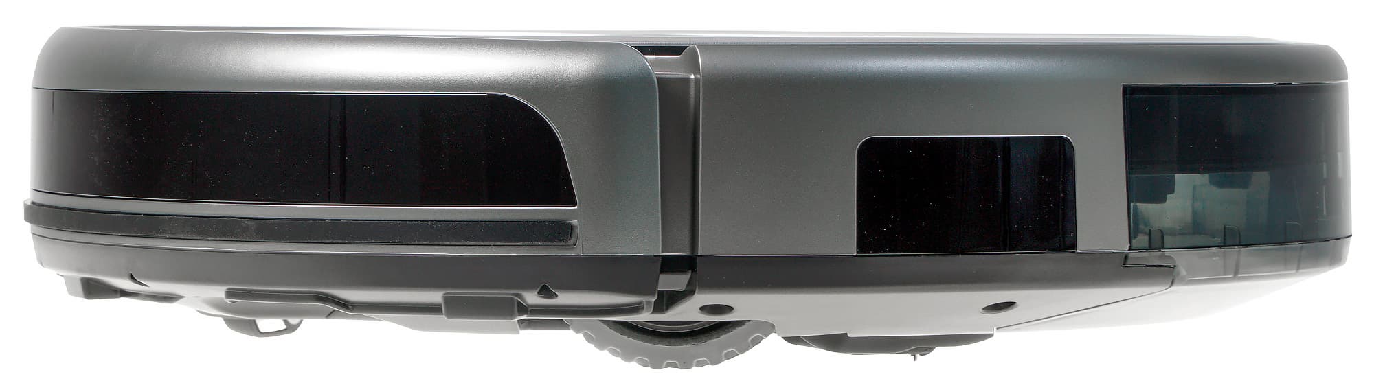 Переднюю половину боковой стороны устройства занимает подвижный подпружиненный бампер с ходом в 4-5 мм. Его нажатие вызывает срабатывание механических датчиков приближения. За затемненным стеклом бампера размещаются ИК-датчики, позволяющие пылесосу обнаруживать препятствия, находить базу и принимать сигналы пульта управления.