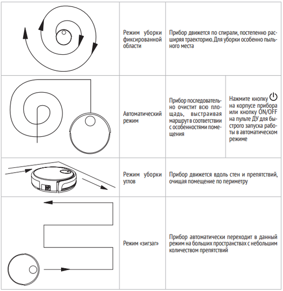 - режим уборки фиксированной области — прибор движется по спирали, постепенно расширяя траекторию (для уборки особенно пыльного места);