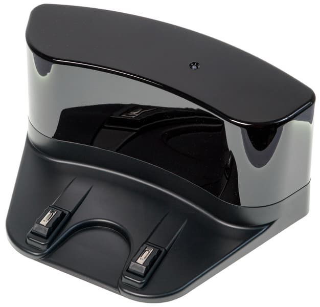 Верхняя часть базы выполнена из ИК-прозрачного пластика, под которым стоят датчики, обеспечивающие позиционирование робота при возвращении на зарядку. У базы есть светодиод, сигнализирующий о ходе пополнения батареи. Контакты подпружинены и имеют ход около 3 мм.