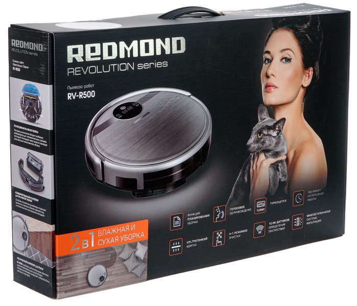 Робот-пылесос Redmond RV-R500 упакован в небольшую красочно оформленную коробку из гофрокартона. На внешних плоскостях коробки есть изображения самого робота, а также перечислены его основные особенности и характеристики. Надписи преимущественно на русском и английском языках. Для защиты и распределения содержимого применяются формы из пенопласта и пластиковые пакеты. Коробка оснащена пластиковой ручкой, поэтому донести покупку до дома будет нетрудно.