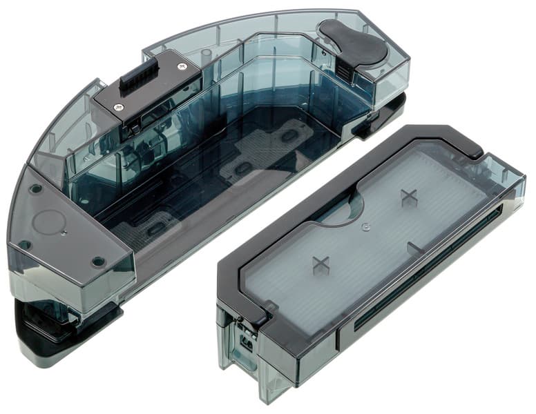 Модуль для влажной уборки состоит из двух частей — крупного контейнера для воды, в который вставляется мелкий отсек с HEPA-фильтром. Отсек для мусора открывается и закрывается с помощью пластиковой защелки. Для фиксации отсека для пыли внутри контейнера для воды используется еще одна защелка и специальная откидная ручка. Отверстие для наполнения находится на верхней панели вставки и закрыто резиновой пробкой.