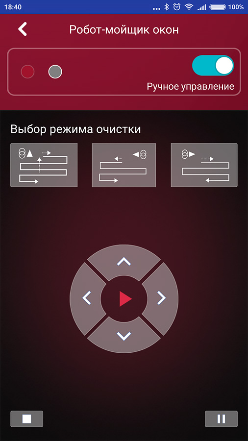 Пульт дистанционного управления позволяет выбрать один из трех автоматических режимов, отвечающих за траекторию движения робота — вверх, влево и вниз/влево и вниз/вправо и вниз. Все эти режимы подразумевают движение «змейкой» с покрытием всей поверхности окна. Отличаются они только начальной точкой запуска робота — в верхней либо в нижней части окна.