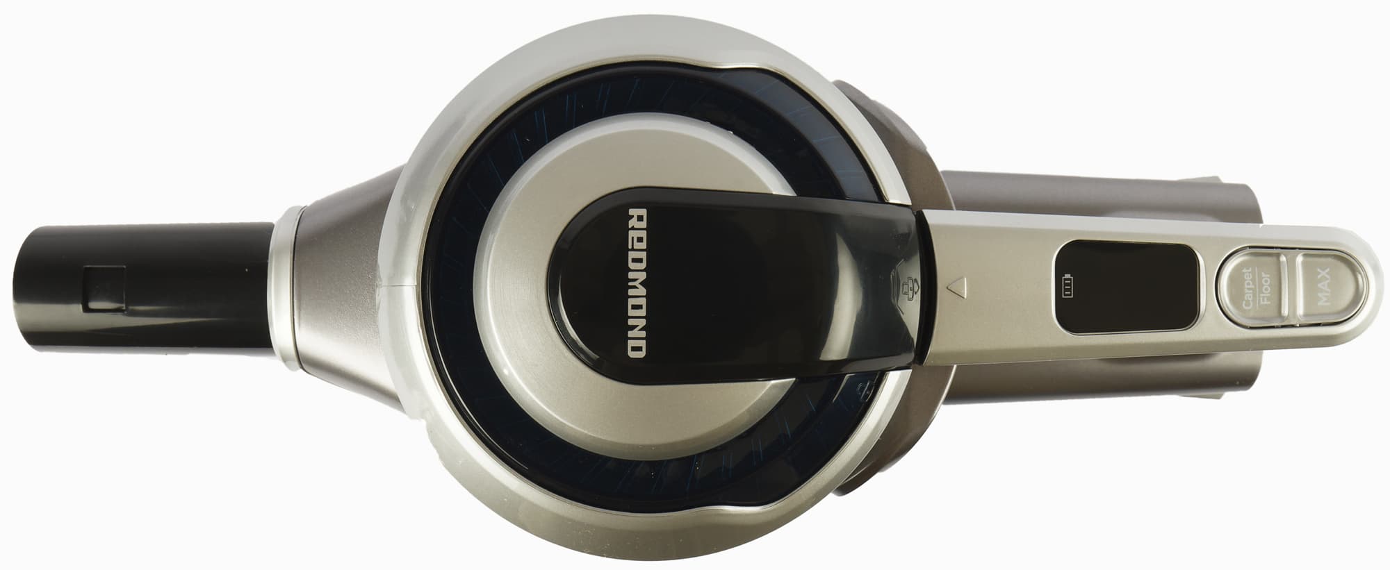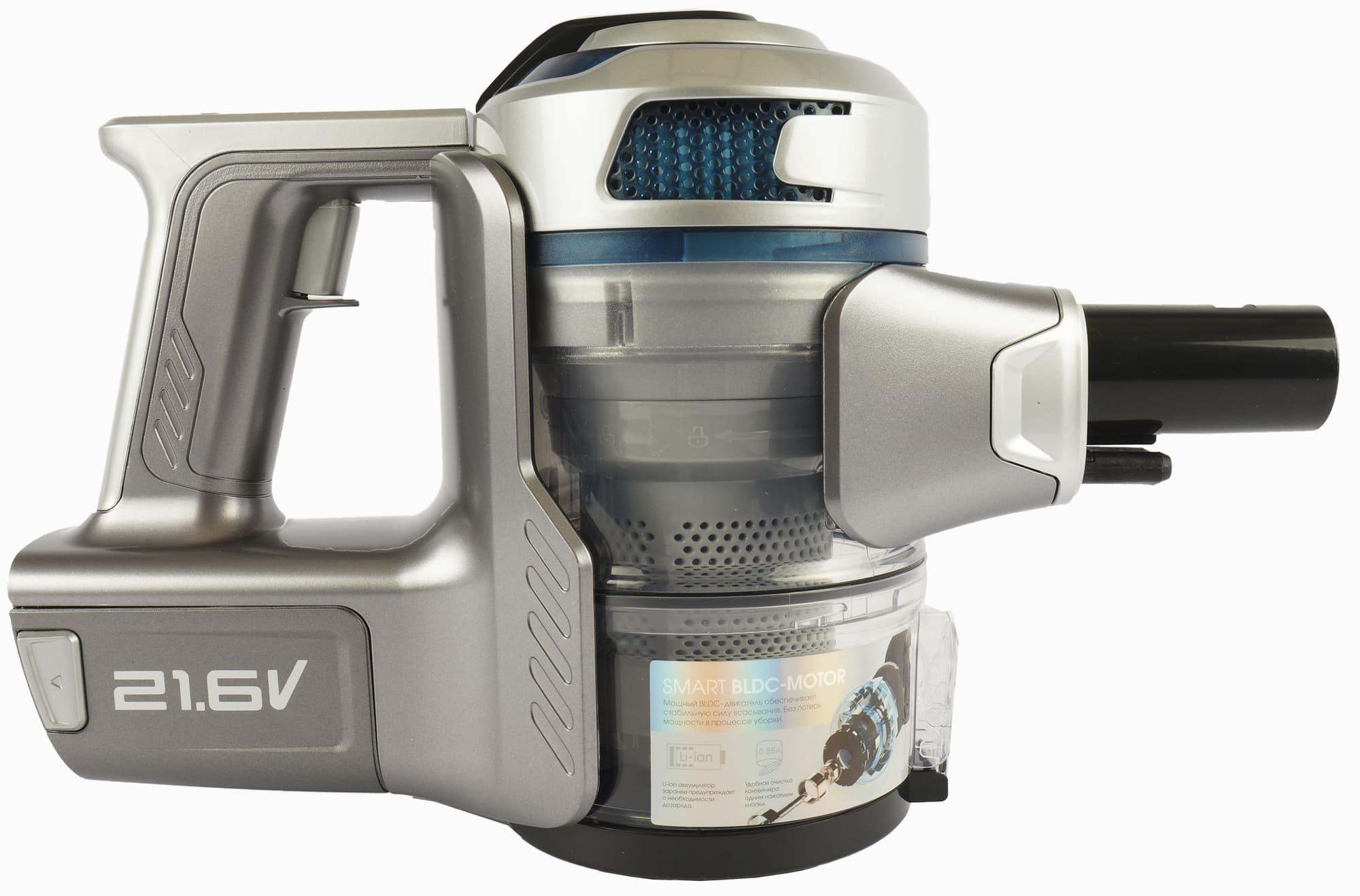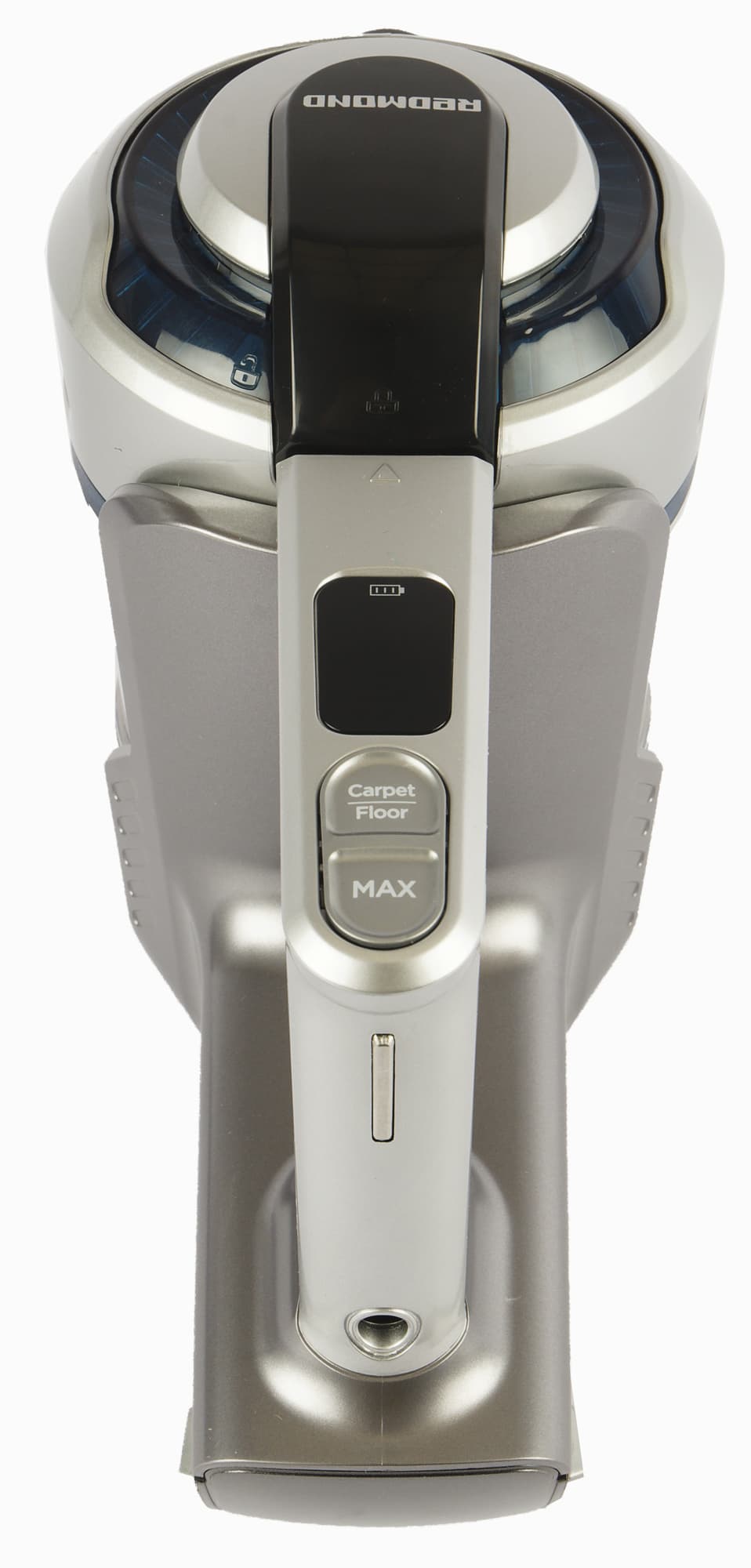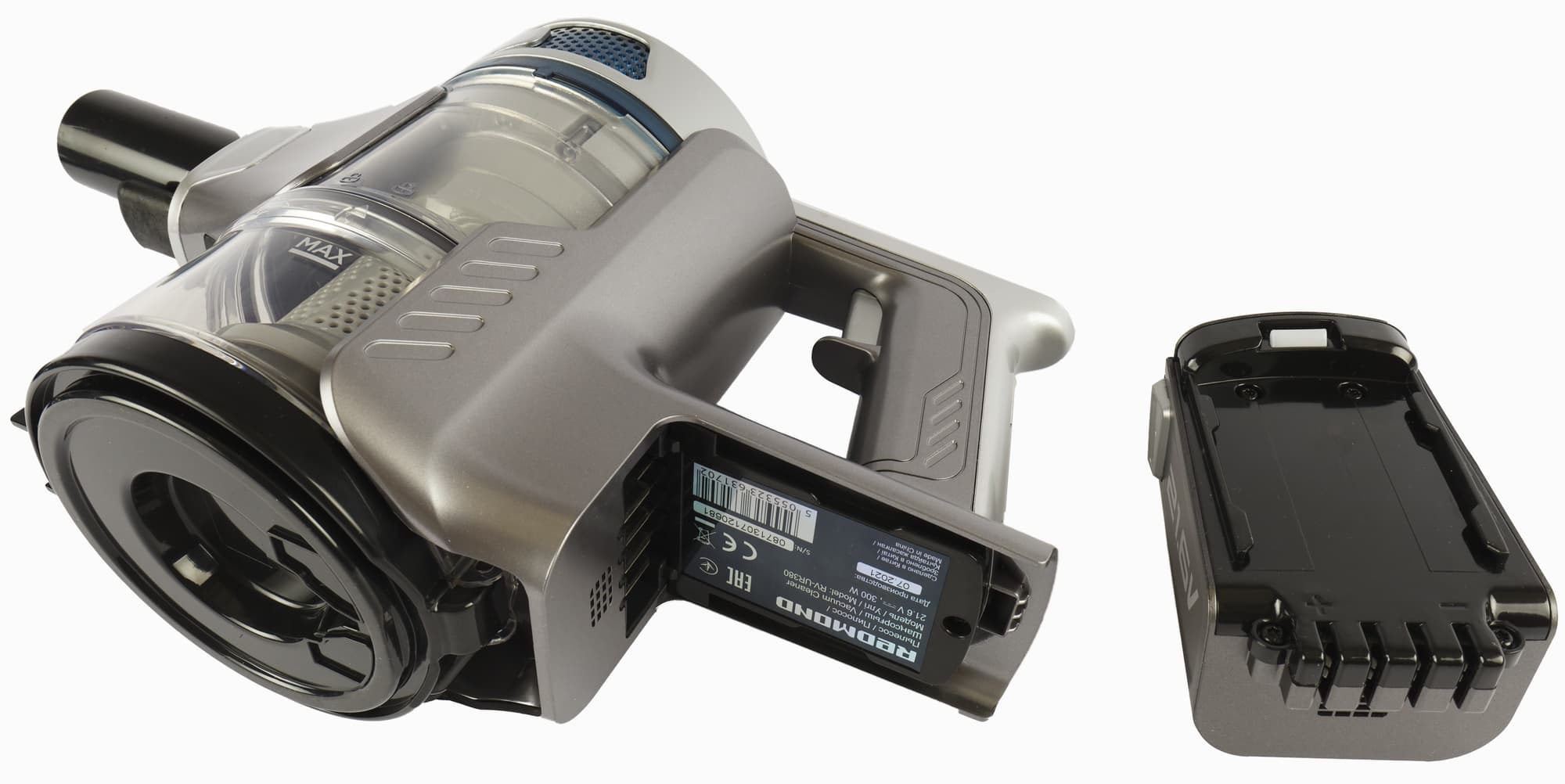 В задней части — «пистолетная» рукоятка со «спусковым крючком», включающим и выключающим пылесос. Ниже находится съемный аккумулятор на 2500 мА·ч.