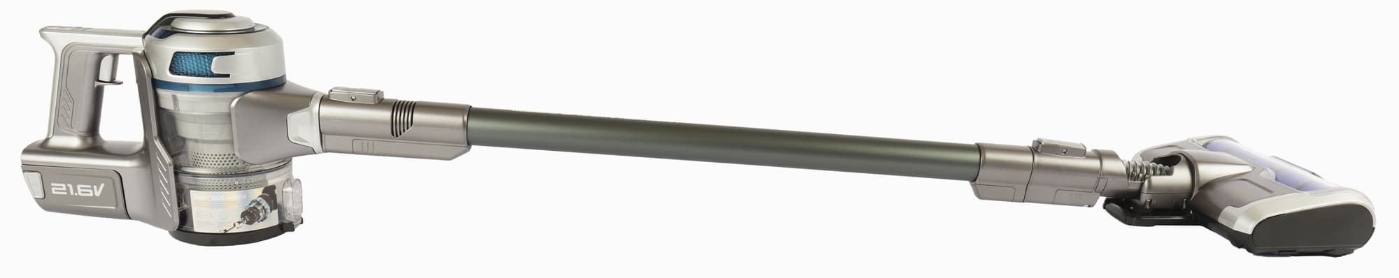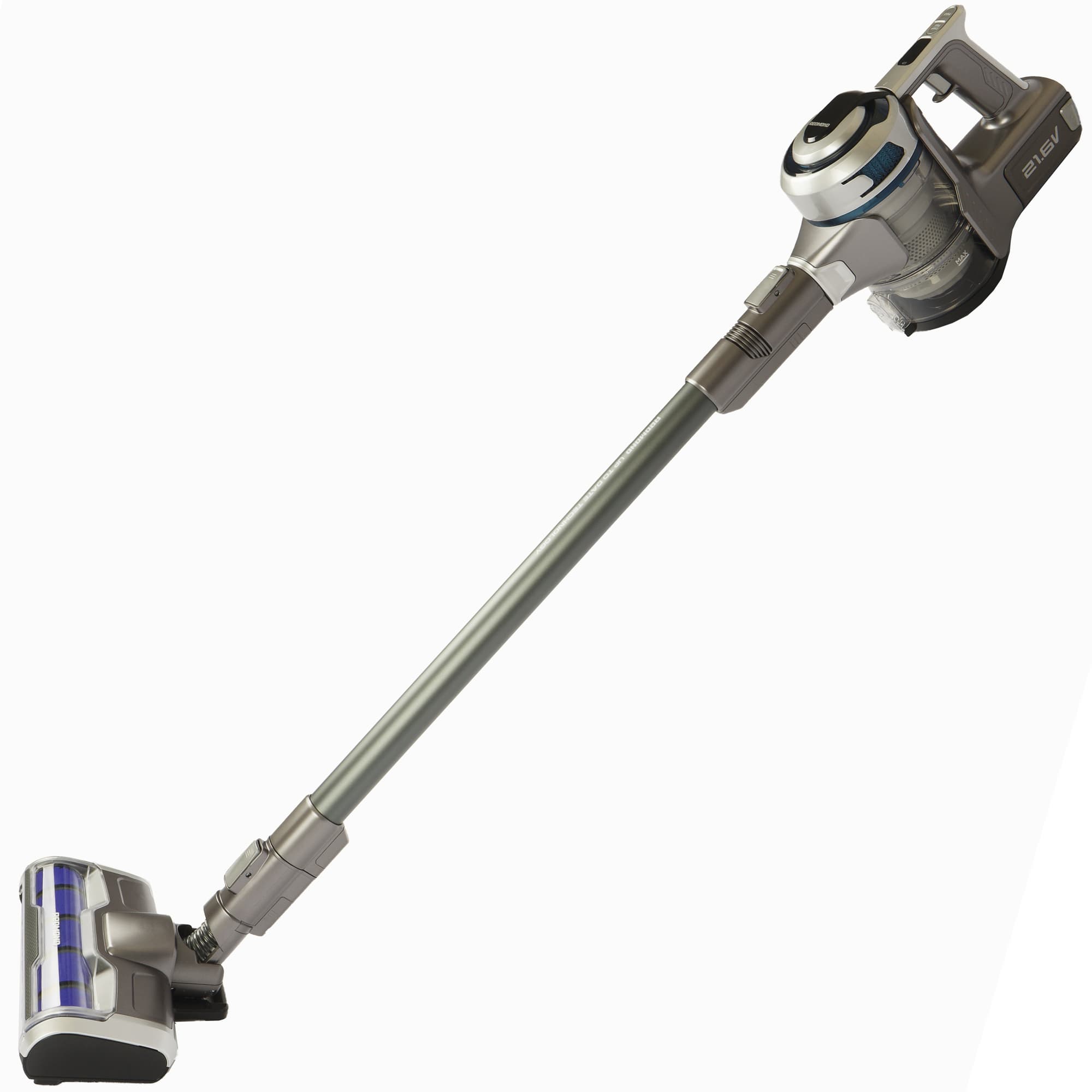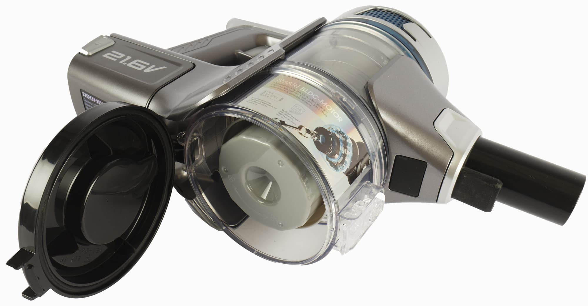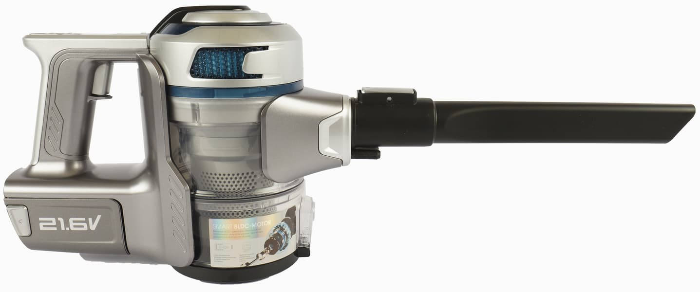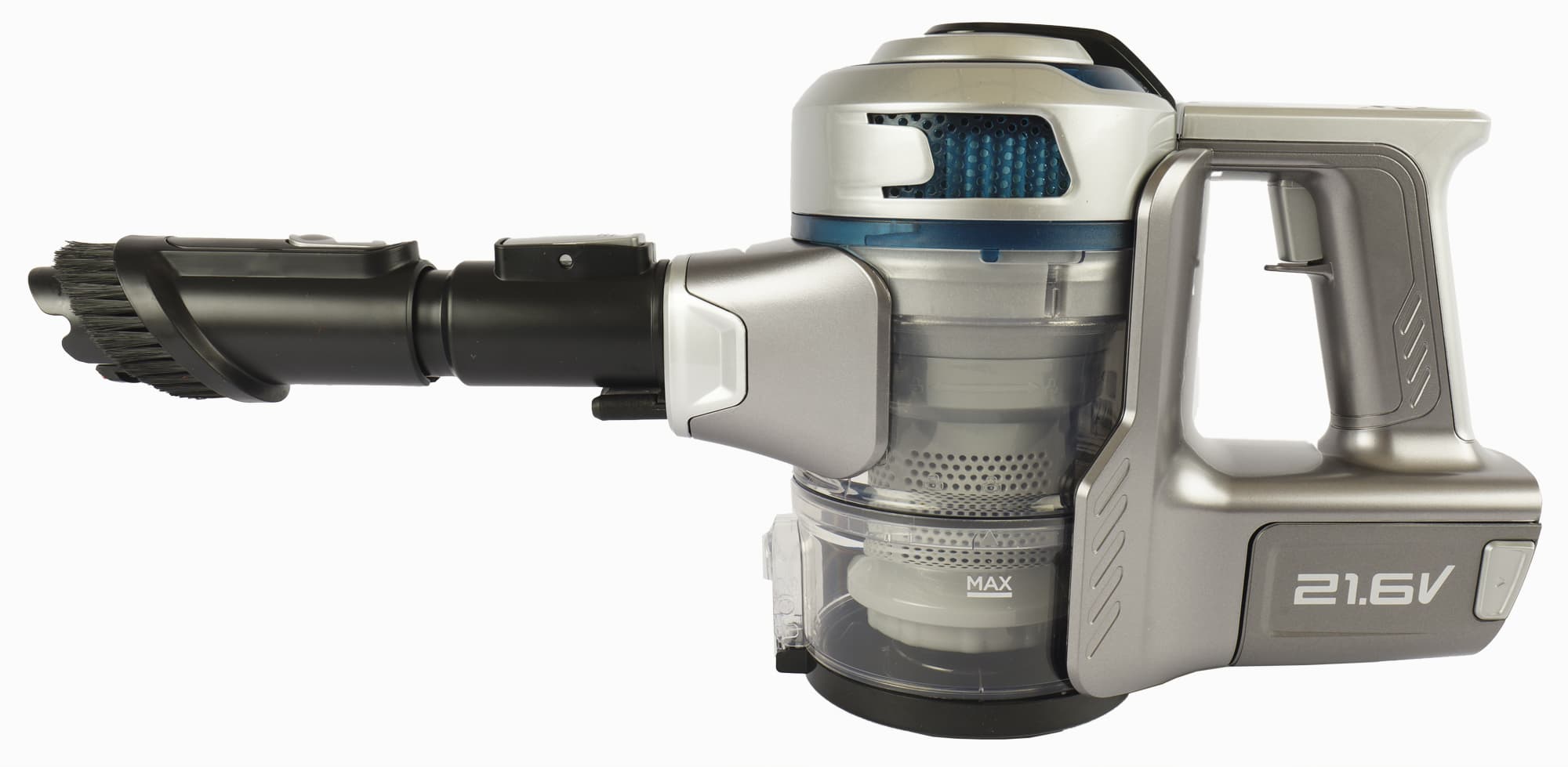В задней части — «пистолетная» рукоятка со «спусковым крючком», включающим и выключающим пылесос. Ниже находится съемный аккумулятор на 2500 мА·ч.