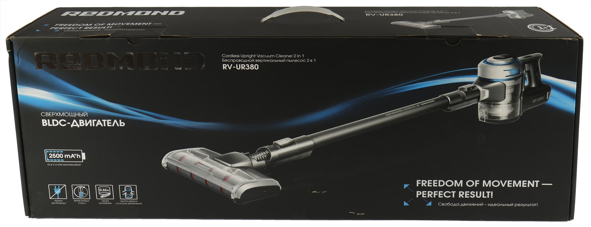 Вертикальный аккумуляторный пылесос Redmond RV-UR380 — современное устройство для быстрой ежедневной уборки. В ходе лабораторных тестов он продемонстрировал неплохую для своего класса силу всасывания в максимальном режиме. Сравнительно высокую мощность мы зафиксировали и на минимальных оборотах двигателя. Но это достоинство становится причиной не слишком большой продолжительностью автономной работы.