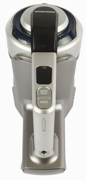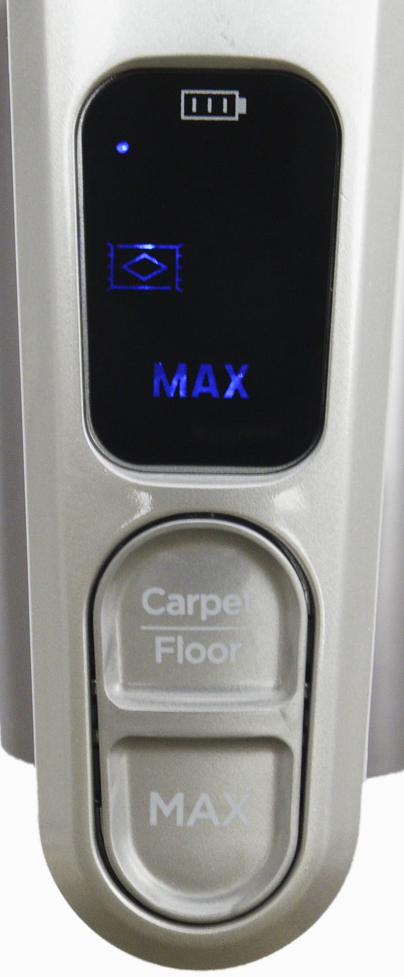 Синий светодиодный дисплей отображает текущую мощность всасывания и выбранный режим вращения напольной щетки. В верхней части у него трехсекционный индикатор уровня заряда аккумулятора.