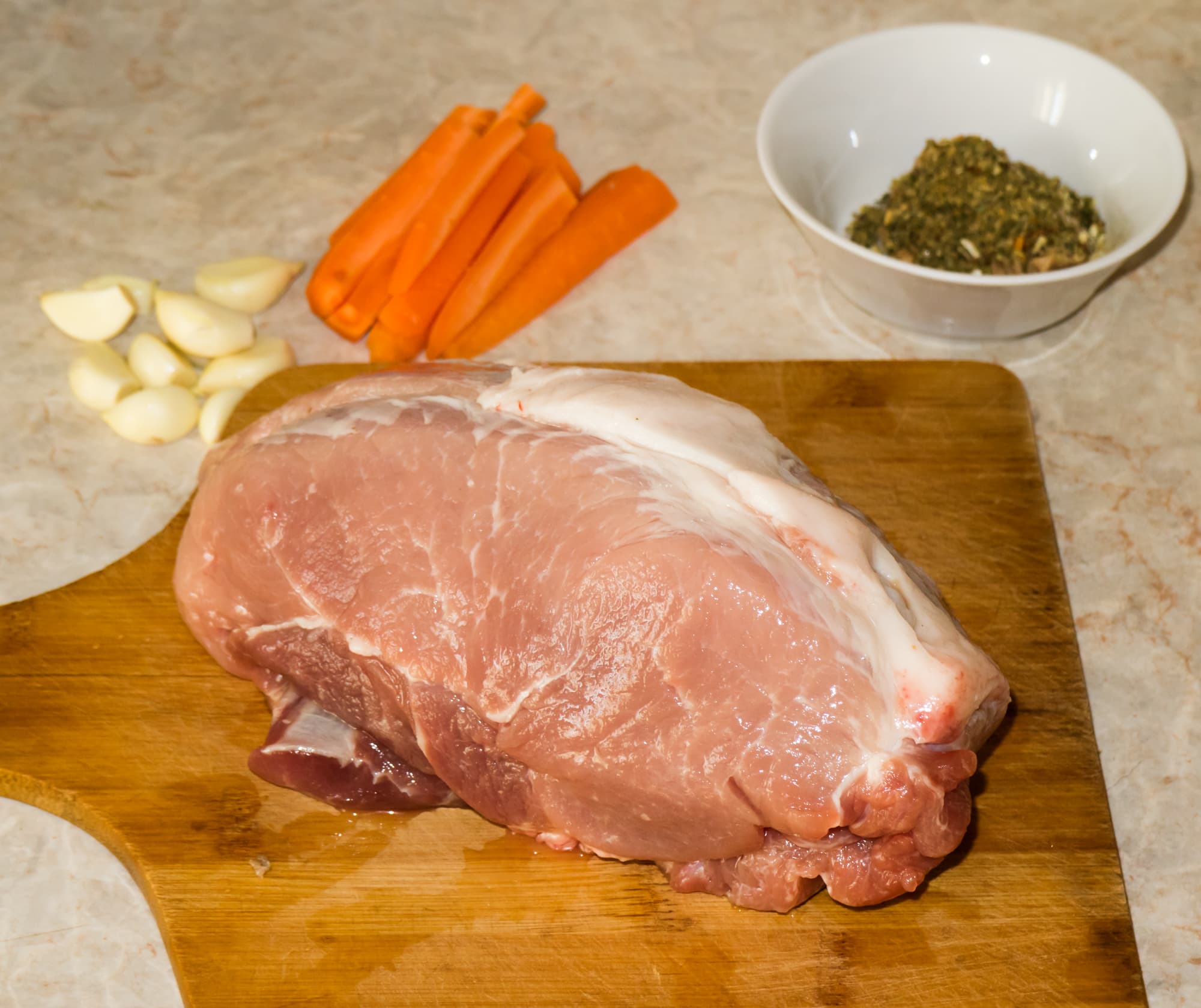 Свинина — 1 кг, морковь — 50 г, горчица — 30 г, чеснок — 10 г, лист лавровый — 2 шт., вода — 5 л, соль, специи.