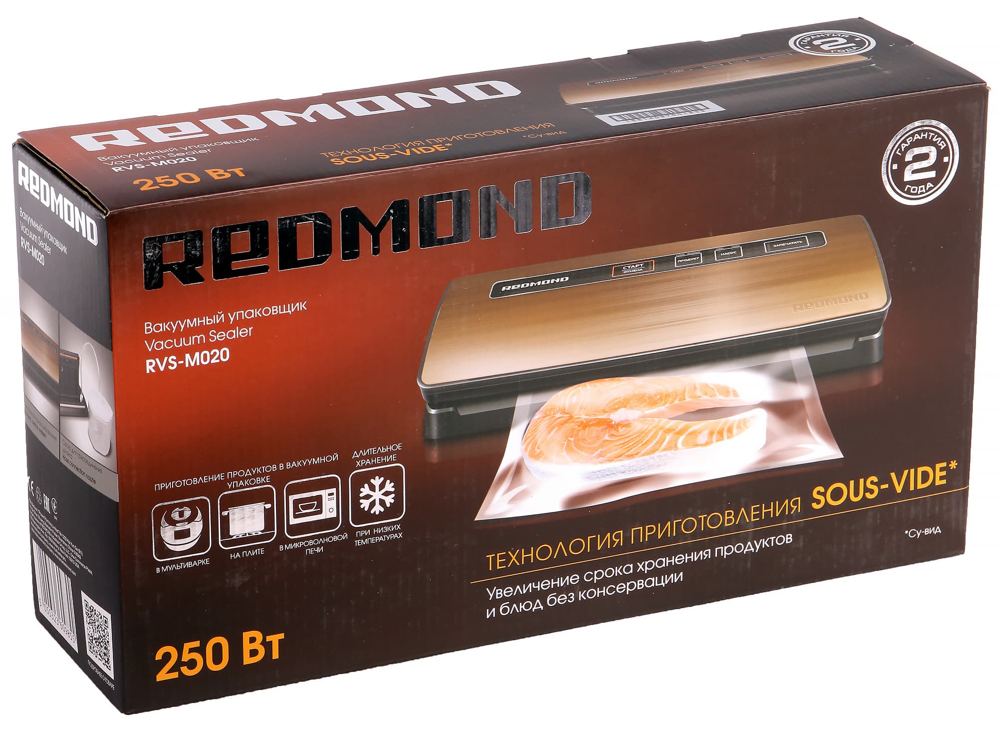 Прибор поставляется в небольшой картонной коробке, традиционно для Redmond ярко оформленной. На упаковке размещена крупная фотография самого устройства и завакуумированного с его помощью куска лосося. Небольшие схематические изображения рассказывают о функциональном предназначении вакуумного упаковщика. На боковых сторонах можно ознакомиться с техническими характеристиками и особенностями прибора.
